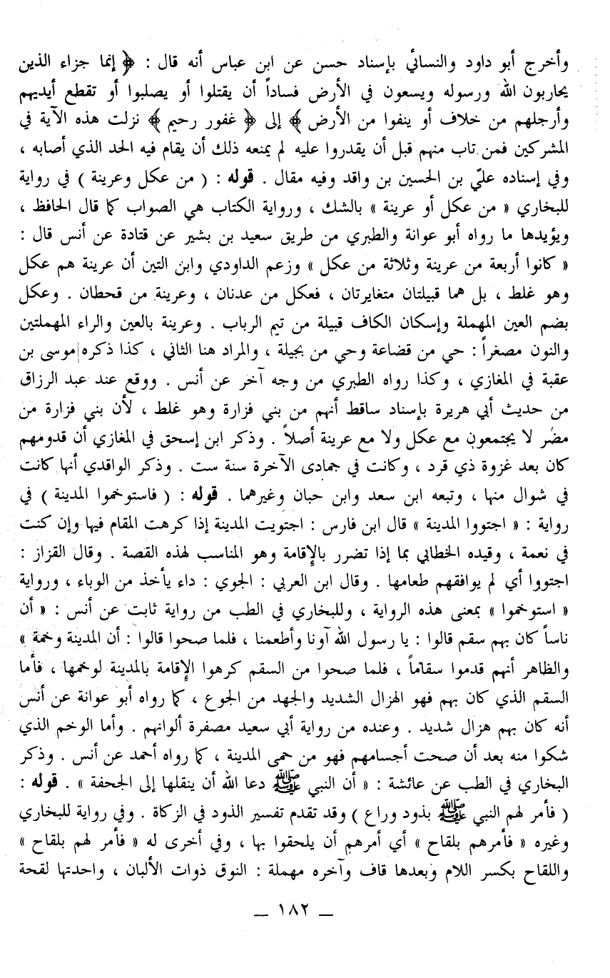 ـــــــــــــــــــــــــــــQوَأَخْرَجَ أَبُو دَاوُد وَالنَّسَائِيُّ بِإِسْنَادٍ حَسَنٍ عَنْ ابْنِ عَبَّاسٍ أَنَّهُ قَالَ: {إِنَّمَا جَزَاءُ الَّذِينَ يُحَارِبُونَ اللَّهَ وَرَسُولَهُ وَيَسْعَوْنَ فِي الأَرْضِ فَسَادًا أَنْ يُقَتَّلُوا أَوْ يُصَلَّبُوا أَوْ تُقَطَّعَ أَيْدِيهِمْ وَأَرْجُلُهُمْ مِنْ خِلافٍ أَوْ يُنْفَوْا مِنَ الأَرْضِ} [المائدة: 33] إلَى {غَفُورٌ رَحِيمٌ} [المائدة: 34] نَزَلَتْ هَذِهِ الْآيَةُ فِي الْمُشْرِكِينَ فَمَنْ تَابَ مِنْهُمْ قَبْلَ أَنْ يَقْدِرُوا عَلَيْهِ لَمْ يَمْنَعْهُ ذَلِكَ أَنْ يُقَامَ فِيهِ الْحَدُّ الَّذِي أَصَابَهُ، وَفِي إسْنَادِهِ عَلِيُّ بْنُ الْحُسَيْنِ بْنُ وَاقِدٍ وَفِيهِ مَقَالٌ. قَوْلُهُ: (مِنْ عُكْلٍ وَعُرَيْنَةَ) فِي رِوَايَةٍ لِلْبُخَارِيِّ " مِنْ عُكْلٍ أَوْ عُرَيْنَةَ " بِالشَّكِّ، وَرِوَايَةُ الْكِتَابِ هِيَ الصَّوَابُ كَمَا قَالَ الْحَافِظُ، وَيُؤَيِّدُهَا مَا رَوَاهُ أَبُو عَوَانَةَ وَالطَّبَرِيُّ مِنْ طَرِيقِ سَعِيدِ بْنِ بَشِيرٍ عَنْ قَتَادَةَ عَنْ أَنَسٍ قَالَ: " كَانُوا أَرْبَعَةً مِنْ عُرَيْنَةَ وَثَلَاثَةً مِنْ عُكْلٍ " وَزَعَمَ الدَّاوُدِيُّ وَابْنُ التِّينِ أَنَّ عُرَيْنَةَ هُمْ عُكْلٌ وَهُوَ غَلَطٌ، بَلْ هُمَا قَبِيلَتَانِ مُتَغَايِرَتَانِ، فَعُكْلٌ مِنْ عَدْنَانَ، وَعُرَيْنَةُ مِنْ قَحْطَانَ.