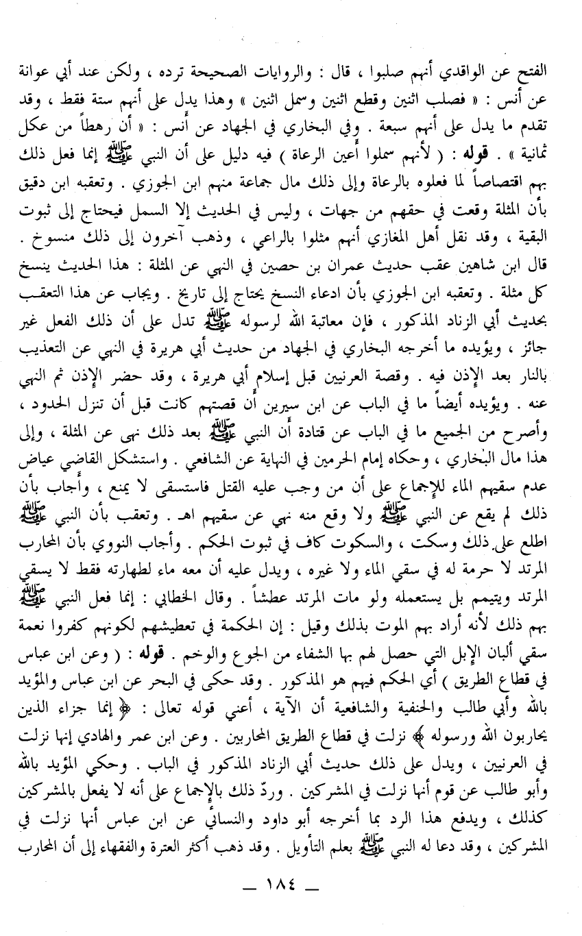 قَالَ ابْنُ شَاهِينَ عَقِبَ حَدِيثِ عِمْرَانَ بْنِ حُصَيْنٍ فِي النَّهْيِ عَنْ الْمُثْلَةِ: هَذَا الْحَدِيثُ يَنْسَخُ كُلَّ مُثْلَةٍ. وَتَعَقَّبَهُ ابْنُ الْجَوْزِيِّ بِأَنَّ ادِّعَاءَ النَّسْخِ يَحْتَاجُ إلَى تَارِيخٍ. وَيُجَابُ عَنْ هَذَا التَّعَقُّبِ بِحَدِيثِ أَبِي الزِّنَادِ الْمَذْكُورِ، فَإِنَّ مُعَاتَبَةَ اللَّهِ لِرَسُولِهِ - صَلَّى اللَّهُ عَلَيْهِ وَسَلَّمَ - تَدُلُّ عَلَى أَنَّ ذَلِكَ الْفِعْلَ غَيْرُ جَائِزٍ، وَيُؤَيِّدُهُ مَا أَخْرَجَهُ الْبُخَارِيُّ فِي الْجِهَادِ مِنْ حَدِيثِ أَبِي هُرَيْرَةَ فِي النَّهْيِ عَنْ التَّعْذِيبِ بِالنَّارِ بَعْدَ الْإِذْنِ فِيهِ. وَقِصَّةُ الْعُرَنِيِّينَ قَبْلَ إسْلَامِ أَبِي هُرَيْرَةَ، وَقَدْ حَضَرَ الْإِذْنُ ثُمَّ النَّهْيُ عَنْهُ. وَيُؤَيِّدُهُ أَيْضًا مَا فِي الْبَابِ عَنْ ابْنِ سِيرِينَ أَنَّ قِصَّتَهُمْ كَانَتْ قَبْلَ أَنْ تَنْزِلَ الْحُدُودُ، وَأَصْرَحُ مِنْ الْجَمِيعِ مَا فِي الْبَابِ عَنْ قَتَادَةَ «أَنَّ النَّبِيَّ - صَلَّى اللَّهُ عَلَيْهِ وَسَلَّمَ - بَعْدَ ذَلِكَ نَهَى عَنْ الْمُثْلَةِ» ، وَإِلَى هَذَا مَالَ الْبُخَارِيُّ، وَحَكَاهُ إمَامُ الْحَرَمَيْنِ فِي النِّهَايَةِ عَنْ الشَّافِعِيِّ. وَاسْتَشْكَلَ الْقَاضِي عِيَاضٌ عَدَمَ سَقْيِهِمْ الْمَاءَ لِلْإِجْمَاعِ عَلَى أَنَّ مَنْ وَجَبَ عَلَيْهِ الْقَتْلُ فَاسْتَسْقَى لَا يُمْنَعُ، وَأَجَابَ بِأَنَّ ذَلِكَ لَمْ يَقَعْ عَنْ النَّبِيِّ - صَلَّى اللَّهُ عَلَيْهِ وَسَلَّمَ - وَلَا وَقَعَ مِنْهُ نَهْيٌ عَنْ سَقْيِهِمْ. اهـ.