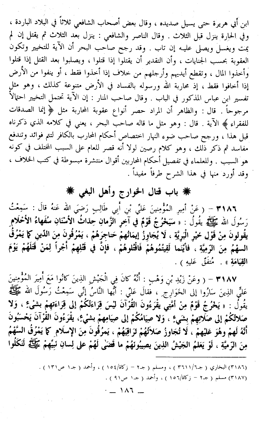 3187 - (وَعَنْ زَيْدِ بْنِ وَهْبٍ - رَضِيَ اللَّهُ عَنْهُ -: أَنَّهُ كَانَ فِي الْجَيْشِ الَّذِينَ كَانُوا مَعَ أَمِيرِ الْمُؤْمِنِينَ عَلِيٍّ الَّذِينَ سَارُوا إلَى الْخَوَارِجِ، فَقَالَ «عَلِيٌّ: أَيّهَا النَّاسُ إنِّي سَمِعْت رَسُولَ اللَّهِ - صَلَّى اللَّهُ عَلَيْهِ وَسَلَّمَ - يَقُولُ: يَخْرُجُ قَوْمٌ مِنْ أُمَّتِي يَقْرَءُونَ الْقُرْآنَ لَيْسَ قِرَاءَتُكُمْ إلَى قِرَاءَتِهِمْ بِشَيْءٍ، وَلَا صَلَاتُكُمْ إلَى صَلَاتِهِمْ بِشَيْءٍ، وَلَا صِيَامُكُمْ إلَى صِيَامِهِمْ بِشَيْءٍ، يَقْرَءُونَ الْقُرْآنَ يَحْسَبُونَ أَنَّهُ لَهُمْ وَهُوَ عَلَيْهِمْ، لَا تُجَاوِزُ صَلَاتُهُمْ تَرَاقِيَهُمْ، يَمْرُقُونَ مِنْ الْإِسْلَامِ كَمَا يَمْرُقُ السَّهْمُ مِنْ الرَّمِيَّةِ، لَوْ يَعْلَمُ الْجَيْشُ الَّذِينَ يُصِيبُونَهُمْ مَا قَضَى لَهُمْ عَلَى لِسَانِ نَبِيِّهِمْ - صَلَّى اللَّهُ عَلَيْهِ وَسَلَّمَ - لَنَكَلُوا