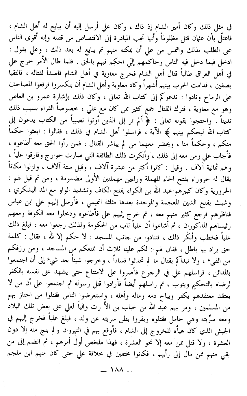 ـــــــــــــــــــــــــــــQفِي مِثْلِ ذَلِكَ وَكَانَ أَمِيرَ الشَّامِ إذْ ذَاكَ، وَكَانَ عَلِيٌّ أَرْسَلَ إلَيْهِ أَنْ يُبَايِعَ لَهُ أَهْلَ الشَّامِ، فَاعْتَلَّ بِأَنَّ عُثْمَانَ قُتِلَ مَظْلُومًا وَأَنَّهَا تَجِبُ الْمُبَادَرَةُ إلَى الِاقْتِصَاصِ مِنْ قَتَلَتِهِ وَأَنَّهُ أَقْوَى النَّاسِ عَلَى الطَّلَبِ بِذَلِكَ وَالْتَمَسَ مِنْ عَلِيٍّ أَنْ يُمَكِّنَهُ مِنْهُمْ ثُمَّ يُبَايِعَ لَهُ بَعْدَ ذَلِكَ، وَعَلِيٌّ يَقُولُ: اُدْخُلْ فِيمَا دَخَلَ فِيهِ النَّاسُ وَحَاكِمْهُمْ إلَيَّ أَحْكُمْ فِيهِمْ بِالْحَقِّ.
