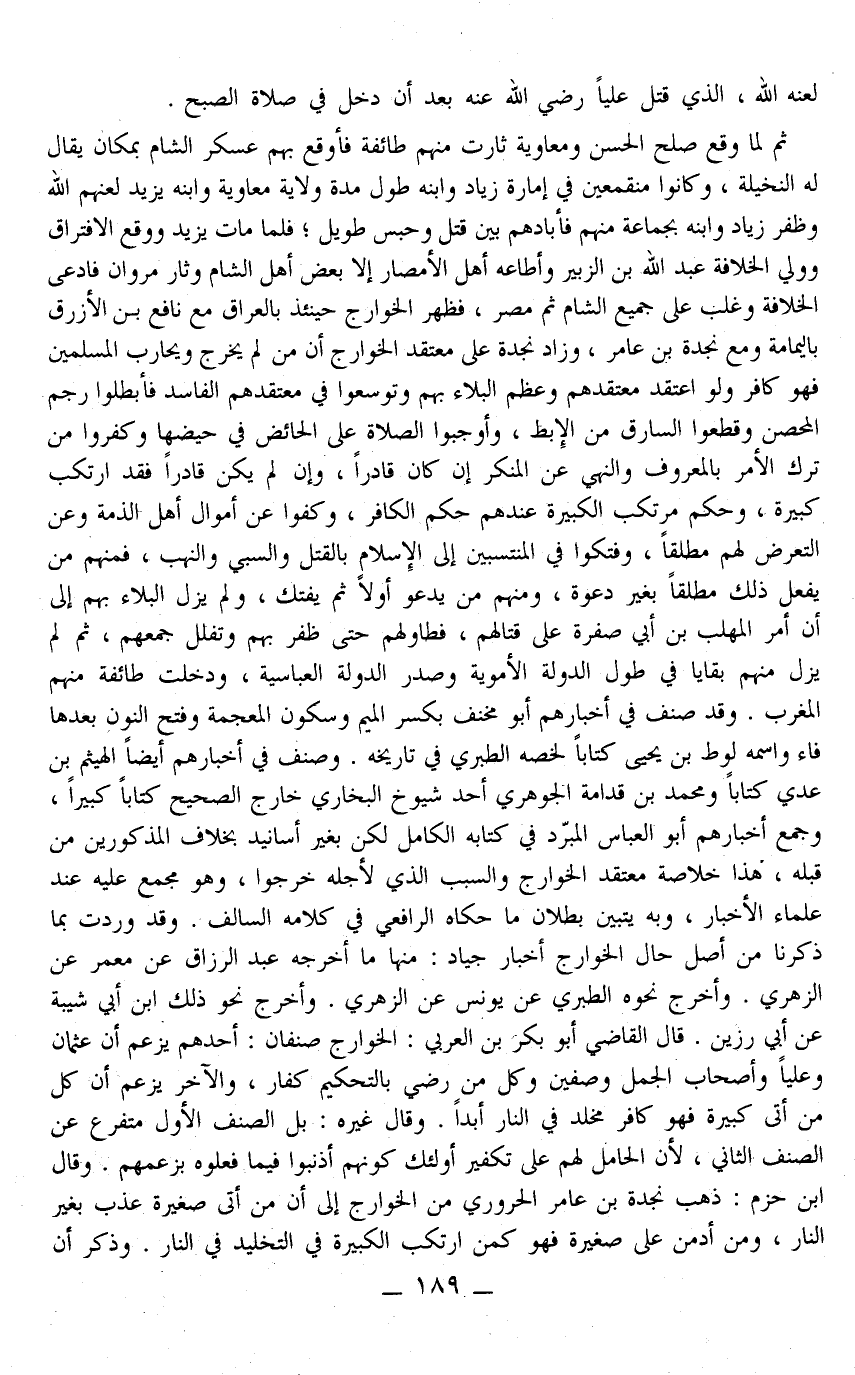 وَقَدْ صَنَّفَ فِي أَخْبَارِهِمْ أَبُو مِخْنَفٍ بِكَسْرِ الْمِيمِ وَسُكُونِ الْمُعْجَمَةِ وَفَتْحِ النُّونِ بَعْدَهَا فَاءٌ وَاسْمُهُ لُوطُ بْنُ يَحْيَى كِتَابًا لَخَّصَهُ الطَّبَرِيُّ فِي تَارِيخِهِ. وَصَنَّفَ فِي أَخْبَارِهِمْ أَيْضًا الْهَيْثَمُ بْنُ عَدِيٍّ كِتَابًا وَمُحَمَّدُ بْنُ قُدَامَةَ الْجَوْهَرِيُّ أَحَدُ شُيُوخِ الْبُخَارِيِّ خَارِجَ الصَّحِيحِ كِتَابًا كَبِيرًا، وَجَمَعَ أَخْبَارَهُمْ أَبُو الْعَبَّاسِ الْمُبَرِّدُ فِي كِتَابِهِ الْكَامِلِ لَكِنْ بِغَيْرِ أَسَانِيدَ بِخِلَافِ الْمَذْكُورِينَ مِنْ قَبْلِهِ، هَذَا خُلَاصَةُ مُعْتَقَدِ الْخَوَارِجِ وَالسَّبَبُ الَّذِي لِأَجْلِهِ خَرَجُوا، وَهُوَ مُجْمَعٌ عَلَيْهِ عِنْدَ عُلَمَاءِ الْأَخْبَارِ، وَبِهِ يَتَبَيَّنُ بُطْلَانُ مَا حَكَاهُ الرَّافِعِيُّ فِي كَلَامِهِ السَّالِفِ. وَقَدْ وَرَدَتْ بِمَا ذَكَرْنَا مِنْ أَصْلِ حَالِ الْخَوَارِجِ أَخْبَارٌ جِيَادٌ: مِنْهَا مَا أَخْرَجَهُ عَبْدُ الرَّزَّاقِ عَنْ مَعْمَرٍ عَنْ الزُّهْرِيِّ. وَأَخْرَجَ نَحْوَهُ الطَّبَرِيُّ عَنْ يُونُسَ عَنْ الزُّهْرِيِّ. وَأَخْرَجَ نَحْوَ ذَلِكَ ابْنُ أَبِي شَيْبَةَ عَنْ أَبِي رَزِينٍ.
