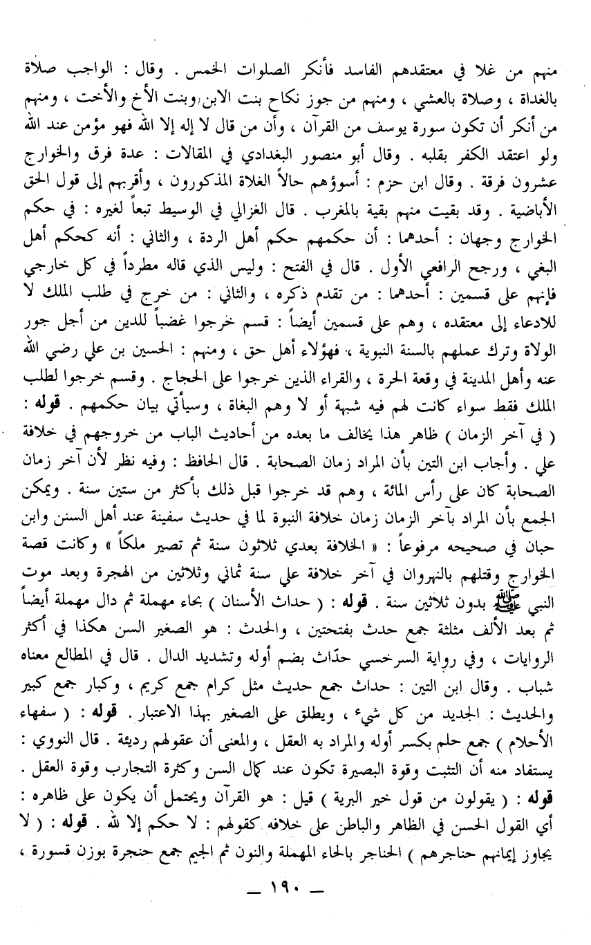 وَقَالَ: الْوَاجِبُ صَلَاةٌ بِالْغَدَاةِ، وَصَلَاةٌ بِالْعَشِيِّ، وَمِنْهُمْ مَنْ جَوَّزَ نِكَاحَ بِنْتِ الِابْنِ وَبِنْتِ الْأَخِ وَالْأُخْتِ، وَمِنْهُمْ مَنْ أَنْكَرَ أَنْ تَكُونَ سُورَةُ يُوسُفَ مِنْ الْقُرْآنِ، وَأَنَّ مَنْ قَالَ لَا إلَهَ إلَّا اللَّهُ فَهُوَ مُؤْمِنٌ عِنْدَ اللَّهِ وَلَوْ اعْتَقَدَ الْكُفْرَ بِقَلْبِهِ. وَقَالَ أَبُو مَنْصُورٍ الْبَغْدَادِيُّ فِي الْمَقَالَاتِ عِدَّةُ فِرَقِ وَالْخَوَارِجُ عِشْرُونَ فِرْقَةً. وَقَالَ ابْنُ حَزْمٍ: أَسْوَءُهُمْ حَالًا الْغُلَاةُ الْمَذْكُورُونَ، وَأَقْرَبُهُمْ إلَى قَوْلِ الْحَقِّ الْإِبَاضِيَّةُ، وَقَدْ بَقِيَتْ مِنْهُمْ بَقِيَّةٌ بِالْمَغْرِبِ. قَالَ الْغَزَالِيُّ فِي الْوَسِيطِ تَبَعًا لِغَيْرِهِ: فِي حُكْمِ الْخَوَارِجِ وَجْهَانِ: أَحَدُهُمَا: أَنَّ حُكْمَهُمْ حُكْمُ أَهْلِ الرِّدَّةِ، وَالثَّانِي: أَنَّهُ كَحُكْمِ أَهْلِ الْبَغْيِ، وَرَجَّحَ الرَّافِعِيُّ الْأَوَّلَ. قَالَ فِي الْفَتْحِ: وَلَيْسَ الَّذِي قَالَهُ مُطَّرِدًا فِي كُلِّ خَارِجِيٍّ فَإِنَّهُمْ عَلَى قِسْمَيْنِ: أَحَدُهُمَا: مَنْ تَقَدَّمَ ذِكْرُهُ، وَالثَّانِي: مَنْ خَرَجَ فِي طَلَبِ الْمُلْكِ لَا لِلِادِّعَاءِ إلَى مُعْتَقَدِهِ، وَهُمْ عَلَى قِسْمَيْنِ أَيْضًا: قِسْمٌ خَرَجُوا غَضَبًا لِلدِّينِ مِنْ أَجْلِ جَوْرِ الْوُلَاةِ وَتَرْكِ عَمَلِهِمْ بِالسُّنَّةِ النَّبَوِيَّةِ؛ فَهَؤُلَاءِ أَهْلُ حَقٍّ، وَمِنْهُمْ: الْحُسَيْنُ بْنُ عَلِيٍّ - رَضِيَ اللَّهُ عَنْهُ - وَأَهْلُ الْمَدِينَةِ فِي وَقْعَةِ الْحَرَّةِ، وَالْقُرَّاءُ الَّذِينَ خَرَجُوا عَلَى الْحَجَّاجِ. وَقِسْمٌ خَرَجُوا لِطَلَبِ الْمُلْكِ فَقَطْ سَوَاءٌ كَانَتْ لَهُمْ فِيهِ شُبْهَةٌ أَوْ لَا وَهُمْ الْبُغَاةُ، وَسَيَأْتِي بَيَانُ حُكْمِهِمْ. قَوْلُهُ: (فِي آخِرِ الزَّمَانِ) ظَاهِرُ هَذَا يُخَالِفُ مَا بَعْدَهُ مِنْ أَحَادِيثِ الْبَابِ مِنْ خُرُوجِهِمْ فِي خِلَافَةِ عَلِيٍّ. وَأَجَابَ ابْنُ التِّينِ بِأَنَّ الْمُرَادَ زَمَانُ الصَّحَابَةِ قَالَ الْحَافِظُ: وَفِيهِ نَظَرٌ لِأَنَّ آخِرَ زَمَانِ الصَّحَابَةِ كَانَ عَلَى رَأْسِ الْمِائَةِ، وَهُمْ قَدْ خَرَجُوا قَبْلَ ذَلِكَ بِأَكْثَرِ مِنْ سِتِّينَ سَنَةً. وَيُمْكِنُ الْجَمْعُ بِأَنَّ الْمُرَادَ بِآخِرِ الزَّمَانِ زَمَانُ خِلَافَةِ النُّبُوَّةِ لِمَا فِي حَدِيثِ سَفِينَةَ عِنْدَ أَهْلِ السُّنَنِ وَابْنِ حِبَّانَ فِي صَحِيحِهِ مَرْفُوعًا: «الْخِلَافَةُ بَعْدِي ثَلَاثُونَ سَنَةً ثُمَّ تَصِيرُ مُلْكًا» وَكَانَتْ قِصَّةُ الْخَوَارِجِ وَقَتْلُهُمْ بِالنَّهْرَوَانِ فِي آخِرِ خِلَافَةِ عَلِيٍّ سَنَةَ ثَمَانِي وَثَلَاثِينَ مِنْ الْهِجْرَةِ وَبَعْدَ مَوْتِ النَّبِيِّ - صَلَّى اللَّهُ عَلَيْهِ وَسَلَّمَ - بِدُونِ ثَلَاثِينَ سَنَةً.