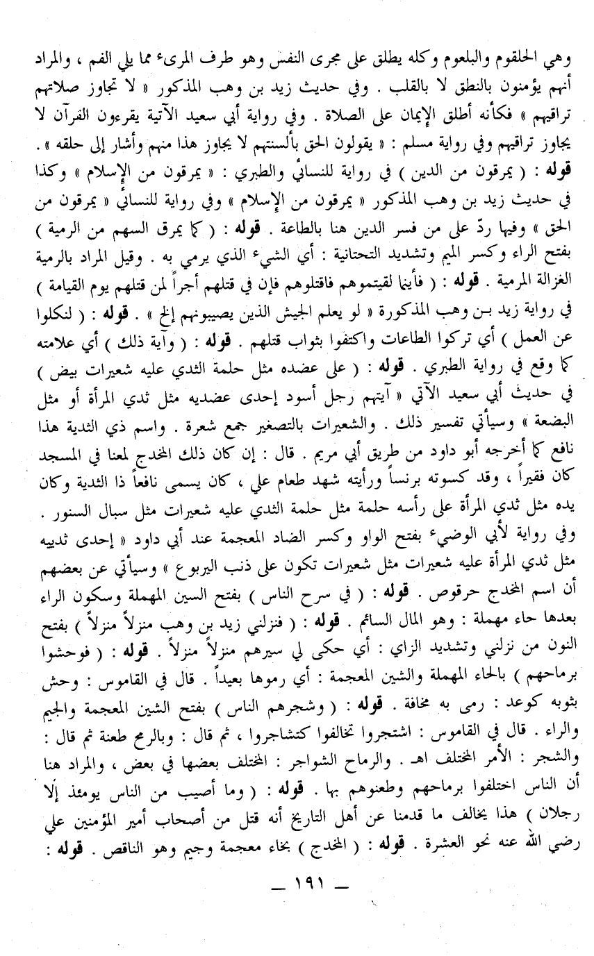 وَفِي رِوَايَةٍ لِأَبِي الْوَضِيءِ بِفَتْحِ الْوَاوِ وَكَسْرِ الضَّادِ الْمُعْجَمَةِ عِنْدَ أَبِي دَاوُد " إحْدَى ثَدْيَيْهِ مِثْلُ ثَدْيِ الْمَرْأَةِ عَلَيْهِ شُعَيْرَاتٌ مِثْلُ شُعَيْرَاتٍ تَكُونُ عَلَى ذَنَبِ الْيَرْبُوعِ " وَسَيَأْتِي عَنْ بَعْضِهِمْ أَنَّ اسْمَ الْمُخْدَجِ حُرْقُوصٌ. قَوْلُهُ: (فِي سَرْحِ النَّاسِ) بِفَتْحِ السِّينِ الْمُهْمَلَةِ وَسُكُونِ الرَّاءِ بَعْدَهَا حَاءٌ مُهْمَلَةٌ: وَهُوَ الْمَالُ السَّائِمُ. قَوْلُهُ: (فَنَزَّلَنِي زَيْدُ بْنُ وَهْبٍ مَنْزِلًا مَنْزِلًا) بِفَتْحِ النُّونِ مِنْ نَزَّلَنِي وَتَشْدِيدِ الزَّايِ: أَيْ حَكَى لِي سَيْرَهُمْ مَنْزِلًا مَنْزِلًا. قَوْلُهُ: (فَوَحَشُوا بِرِمَاحِهِمْ) بِالْحَاءِ الْمُهْمَلَةِ وَالشِّينِ الْمُعْجَمَةِ: أَيْ رَمَوْهَا بَعِيدًا. قَالَ فِي الْقَامُوسِ: وَحَشَ بِثَوْبِهِ كَوَعَدَ: رَمَى بِهِ مَخَافَةً. قَوْلُهُ: (وَشَجَرَهُمْ النَّاسُ) بِفَتْحِ الشِّينِ الْمُعْجَمَةِ وَالْجِيمِ وَالرَّاءِ. قَالَ فِي الْقَامُوسِ: اشْتَجَرُوا تَخَالَفُوا كَتَشَاجَرُوا، ثُمَّ قَالَ: وَبِالرُّمْحِ طَعَنَهُ ثُمَّ قَالَ: وَالشَّجَرُ: الْأَمْرُ الْمُخْتَلِفُ. اهـ. وَالرِّمَاحُ الشَّوَاجِرُ: الْمُخْتَلِفُ بَعْضُهَا فِي بَعْضٍ، وَالْمُرَادُ هُنَا أَنَّ النَّاسَ اخْتَلَفُوا بِرِمَاحِهِمْ وَطَعَنُوهُمْ بِهَا.