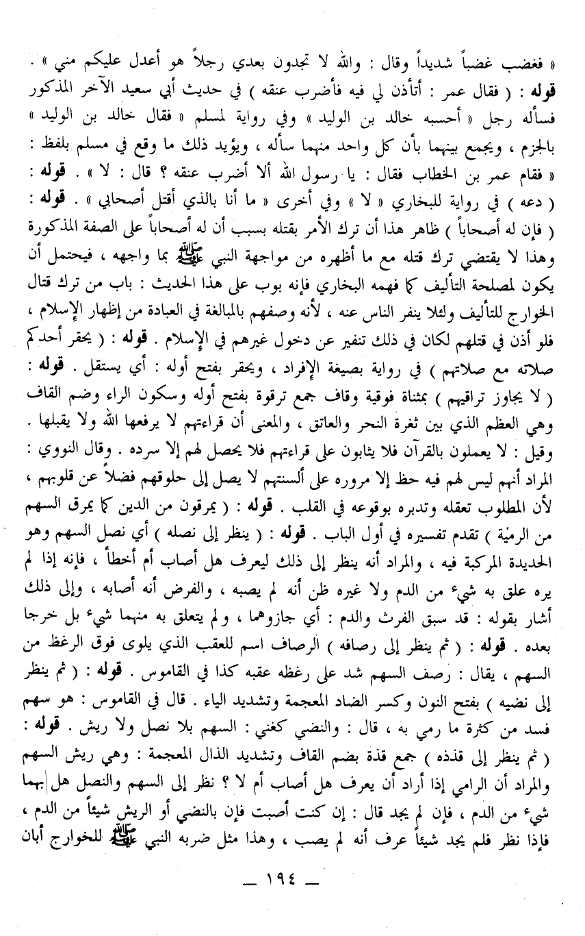 ـــــــــــــــــــــــــــــQفَغَضِبَ غَضَبًا شَدِيدًا وَقَالَ: وَاَللَّهِ لَا تَجِدُونَ بَعْدِي رَجُلًا هُوَ أَعْدَلُ عَلَيْكُمْ مِنِّي ". قَوْلُهُ: (فَقَالَ عُمَرُ: أَتَأْذَنُ لِي فِيهِ فَأَضْرِبَ عُنُقَهُ) فِي حَدِيثِ أَبِي سَعِيدٍ الْآخَرِ الْمَذْكُورِ فَسَأَلَهُ رَجُلٌ " أَحْسَبُهُ خَالِدَ بْنَ الْوَلِيدِ " وَفِي رِوَايَةٍ لِمُسْلِمٍ " فَقَالَ خَالِدُ بْنُ الْوَلِيدِ " بِالْجَزْمِ، وَيُجْمَعُ بَيْنَهُمَا بِأَنَّ كُلَّ وَاحِدٍ مِنْهُمَا سَأَلَهُ، وَيُؤَيِّدُ ذَلِكَ مَا وَقَعَ فِي مُسْلِمٍ بِلَفْظِ: " فَقَامَ عُمَرُ بْنُ الْخَطَّابِ فَقَالَ: يَا رَسُولَ اللَّهِ أَلَا أَضْرِبُ عُنُقَهُ؟ قَالَ: لَا ". قَوْلُهُ: (دَعْهُ) فِي رِوَايَةٍ لِلْبُخَارِيِّ " لَا " وَفِي أُخْرَى " مَا أَنَا بِاَلَّذِي أَقْتُلُ أَصْحَابِي ". قَوْلُهُ: (فَإِنَّ لَهُ أَصْحَابًا) ظَاهِرُ هَذَا أَنَّ تَرْكَ الْأَمْرِ بِقَتْلِهِ بِسَبَبِ أَنَّ لَهُ أَصْحَابًا عَلَى الصِّفَةِ الْمَذْكُورَةِ وَهَذَا لَا يَقْتَضِي تَرْكَ قَتْلِهِ مَعَ مَا أَظْهَرَهُ مِنْ مُوَاجِهَةِ النَّبِيِّ - صَلَّى اللَّهُ عَلَيْهِ وَسَلَّمَ - بِمَا وَاجَهَهُ، فَيُحْتَمَلُ أَنْ يَكُونَ لِمَصْلَحَةِ التَّأْلِيفِ كَمَا فَهِمَهُ الْبُخَارِيُّ فَإِنَّهُ بَوَّبَ عَلَى هَذَا الْحَدِيثِ: بَابُ مَنْ تَرَكَ قِتَالَ الْخَوَارِجِ لِلتَّأْلِيفِ وَلِئَلَّا يَنْفِرَ النَّاسُ عَنْهُ، لِأَنَّهُ وَصَفَهُمْ بِالْمُبَالَغَةِ فِي الْعِبَادَةِ مِنْ إظْهَارِ الْإِسْلَامِ، فَلَوْ أَذِنَ فِي قَتْلِهِمْ لَكَانَ فِي ذَلِكَ تَنْفِيرٌ عَنْ دُخُولِ غَيْرِهِمْ فِي الْإِسْلَامِ. قَوْلُهُ: (يَحْقِرُ أَحَدُكُمْ صَلَاتَهُ مَعَ صَلَاتِهِمْ) فِي رِوَايَةٍ بِصِيغَةِ الْإِفْرَادِ، وَيَحْقِرُ بِفَتْحِ أَوَّلِهِ: أَيْ يَسْتَقِلُّ.