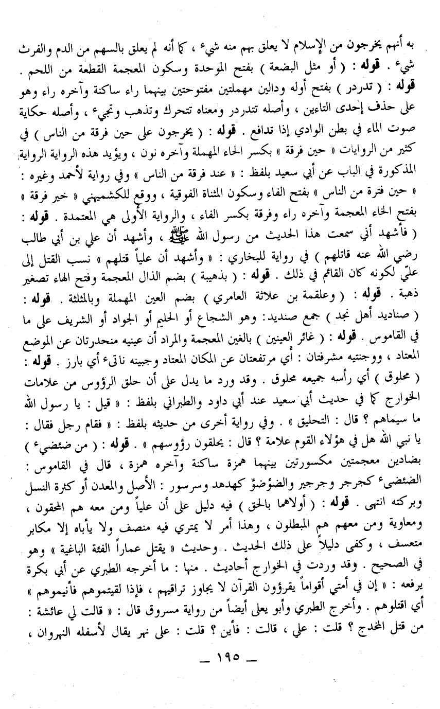 ـــــــــــــــــــــــــــــQبِهِ أَنَّهُمْ يَخْرُجُونَ مِنْ الْإِسْلَامِ لَا يَعْلَقُ بِهِمْ مِنْهُ شَيْءٌ، كَمَا أَنَّهُ لَمْ يَعْلَقْ بِالسَّهْمِ مِنْ الدَّمِ وَالْفَرْثِ شَيْءٌ.