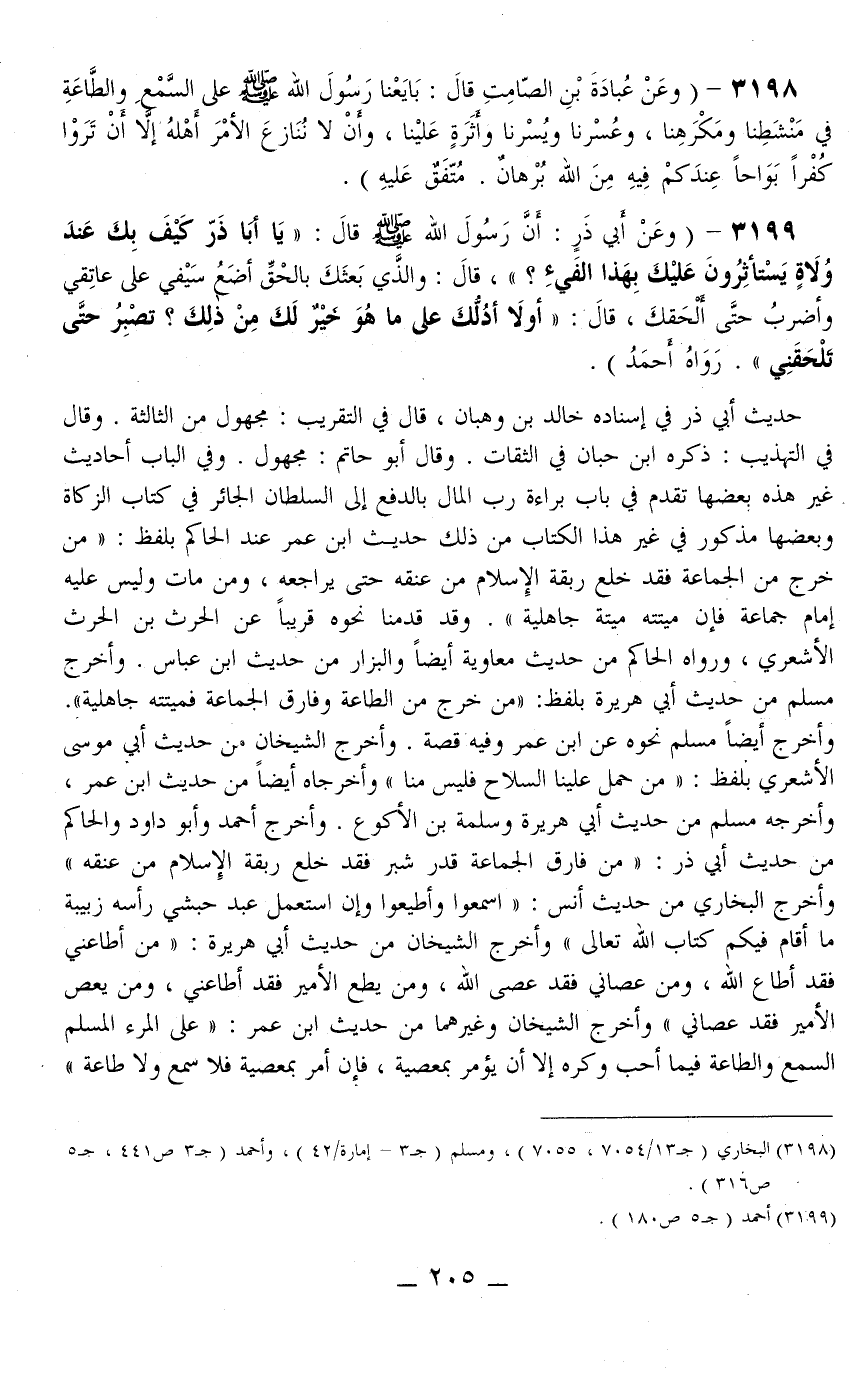 3198 - (وَعَنْ عُبَادَةَ بْنِ الصَّامِتِ قَالَ: «بَايَعَنَا رَسُولُ اللَّهِ - صَلَّى اللَّهُ عَلَيْهِ وَسَلَّمَ - عَلَى السَّمْعِ وَالطَّاعَةِ فِي مَنْشَطِنَا وَمَكْرَهِنَا، وَعُسْرِنَا وَيُسْرِنَا وَأَثَرَةٍ عَلَيْنَا، وَأَنْ لَا نُنَازِعَ الْأَمْرَ أَهْلَهُ إلَّا أَنْ تَرَوْا كُفْرًا بَوَاحًا عِنْدَكُمْ فِيهِ مِنْ اللَّهِ بُرْهَانٌ» . مُتَّفَقٌ عَلَيْهِ) .