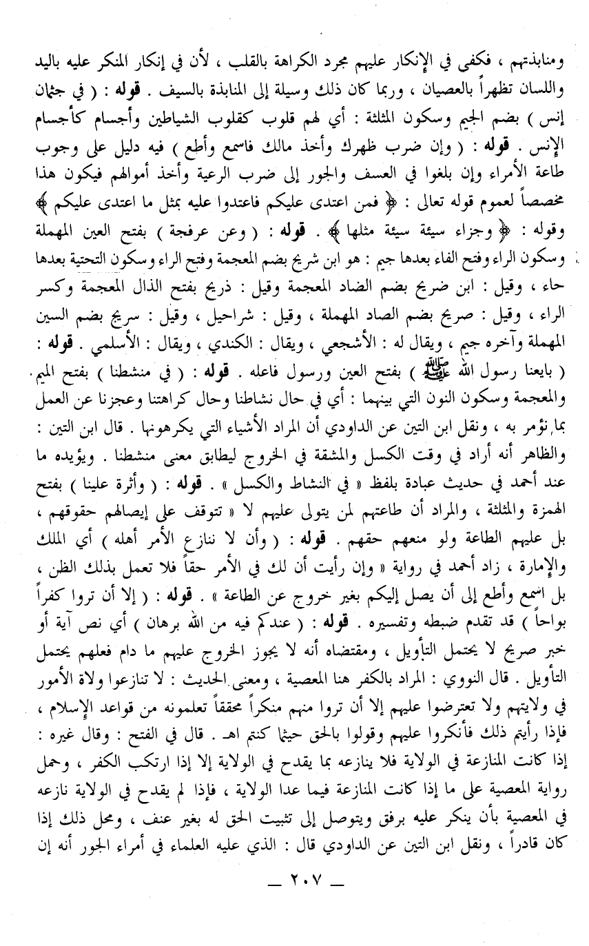 قَالَ فِي الْفَتْحِ وَقَالَ غَيْرُهُ: إذَا كَانَتْ الْمُنَازَعَةُ فِي الْوِلَايَةِ فَلَا يُنَازِعُهُ بِمَا يَقْدَحُ فِي الْوِلَايَةِ إلَّا إذَا ارْتَكَبَ الْكُفْرَ، وَحَمَلَ رِوَايَةَ الْمَعْصِيَةِ عَلَى مَا إذَا كَانَتْ الْمُنَازَعَةُ فِيمَا عَدَا الْوِلَايَةِ، فَإِذَا لَمْ يَقْدَحْ فِي الْوِلَايَةِ نَازَعَهُ فِي الْمَعْصِيَةِ بِأَنْ يُنْكِرَ عَلَيْهِ بِرِفْقٍ وَيَتَوَصَّلَ إلَى تَثْبِيتِ الْحَقِّ لَهُ بِغَيْرِ عُنْفٍ، وَمَحَلُّ ذَلِكَ إذَا كَانَ قَادِرًا، وَنَقَلَ ابْنُ التِّينِ عَنْ الدَّاوُدِيّ قَالَ: الَّذِي عَلَيْهِ الْعُلَمَاءُ فِي أُمَرَاءِ الْجَوْرِ أَنَّهُ إنْ