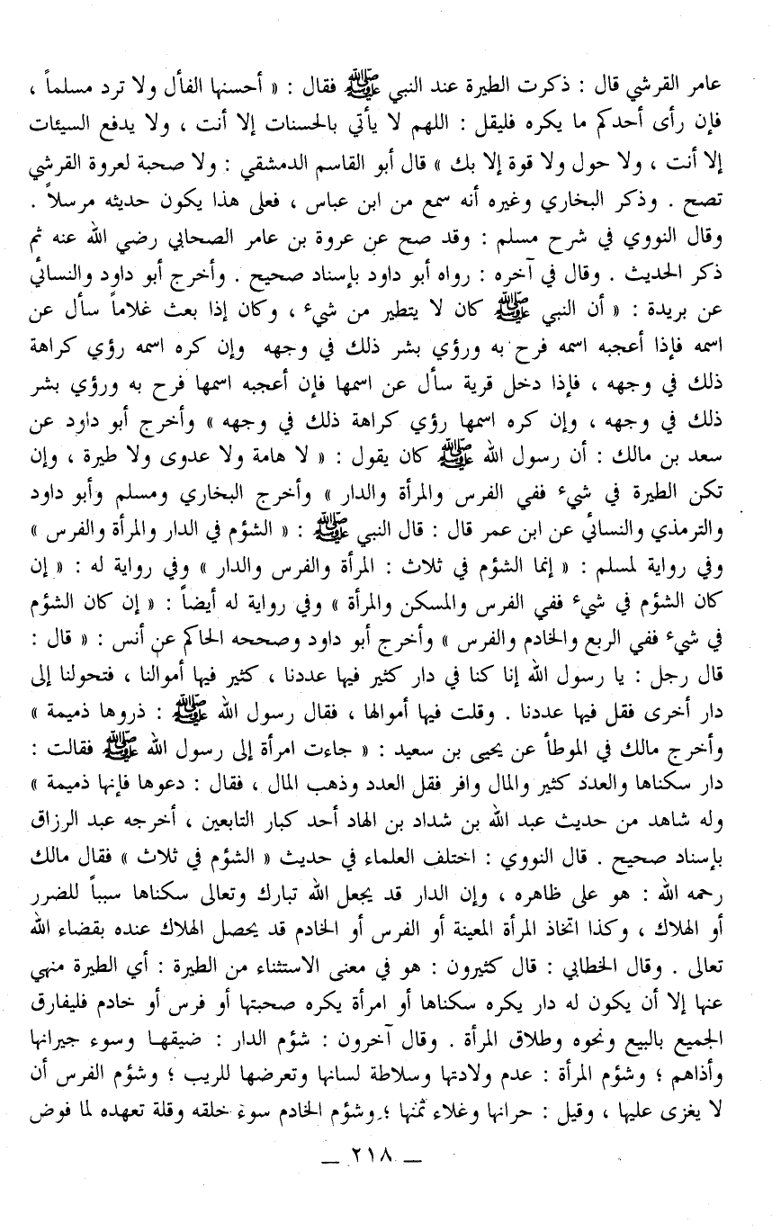 وَأَخْرَجَ الْبُخَارِيُّ وَمُسْلِمٌ وَأَبُو دَاوُد وَالتِّرْمِذِيُّ وَالنَّسَائِيُّ عَنْ ابْنِ عُمَرَ قَالَ: قَالَ النَّبِيُّ - صَلَّى اللَّهُ عَلَيْهِ وَسَلَّمَ -: «الشُّؤْمُ فِي الدَّارِ وَالْمَرْأَةِ وَالْفَرَسِ» وَفِي رِوَايَةٍ لِمُسْلِمٍ: «إنَّمَا الشُّؤْمُ فِي ثَلَاثٍ: الْمَرْأَةِ وَالْفَرَسِ وَالدَّارِ» .