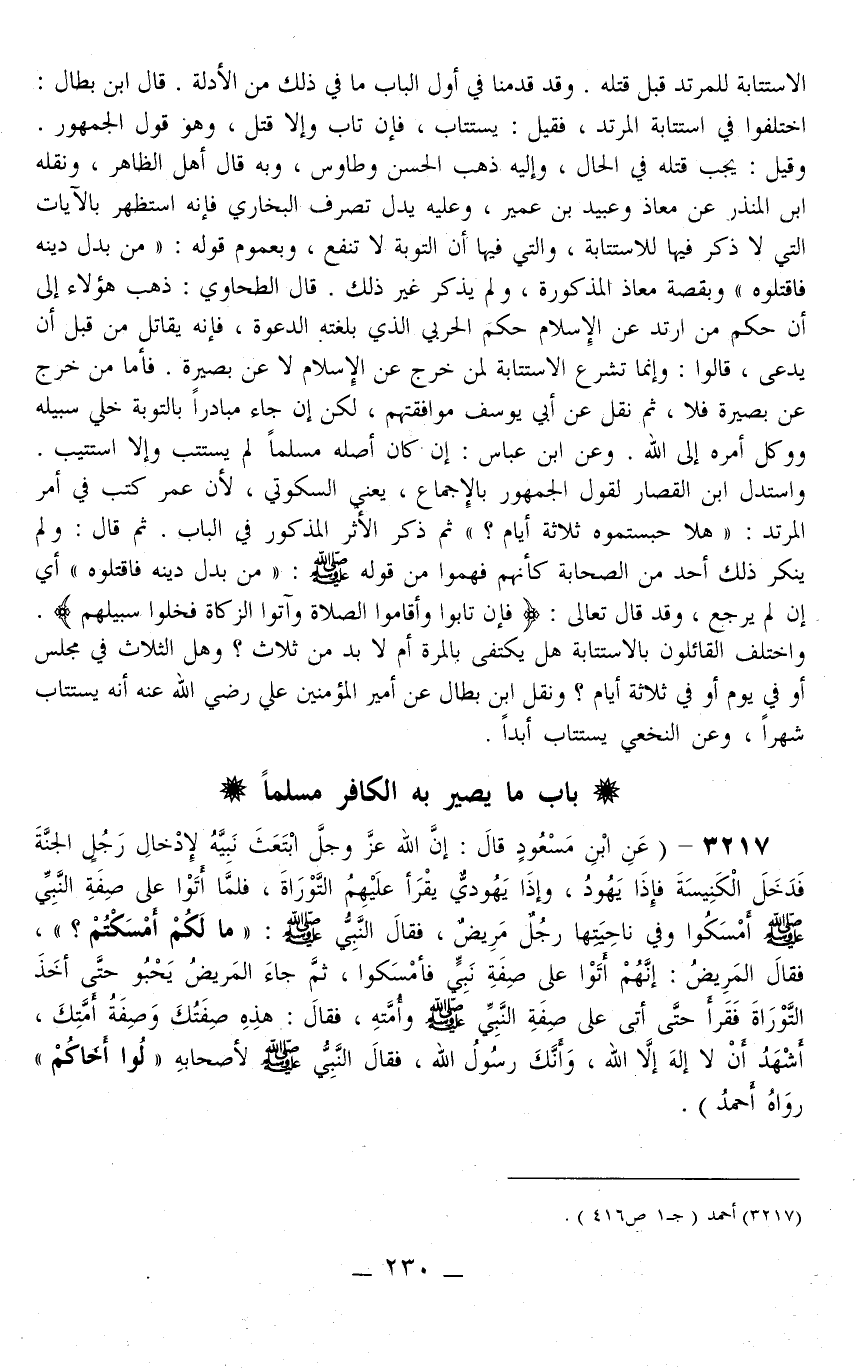 ـــــــــــــــــــــــــــــQالِاسْتِتَابَةَ لِلْمُرْتَدِّ قَبْلَ قَتْلِهِ. وَقَدْ قَدَّمْنَا فِي أَوَّلِ الْبَابِ مَا فِي ذَلِكَ مِنْ الْأَدِلَّةِ. قَالَ ابْنُ بَطَّالٍ: اخْتَلَفُوا فِي اسْتِتَابَةِ الْمُرْتَدِّ، فَقِيلَ: يُسْتَتَابُ، فَإِنْ تَابَ وَإِلَّا قُتِلَ، وَهُوَ قَوْلُ الْجُمْهُورِ.