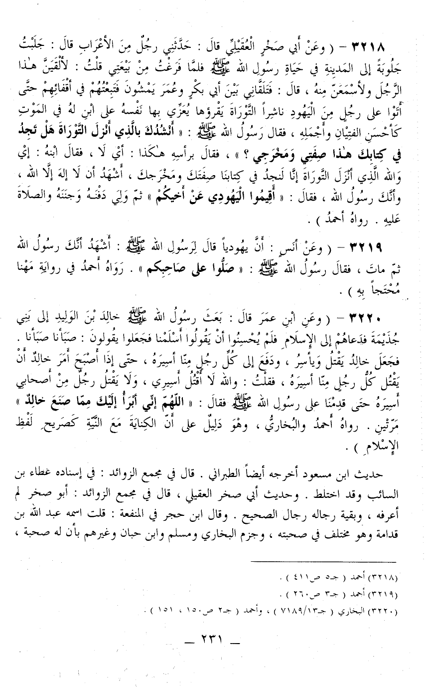 3218 - (وَعَنْ أَبِي صَخْرٍ الْعُقَيْلِيِّ قَالَ: حَدَّثَنِي رَجُلٌ مِنْ الْأَعْرَابِ قَالَ: «جَلَبْت جَلُوبَةً إلَى الْمَدِينَةِ فِي حَيَاةِ رَسُولِ اللَّهِ - صَلَّى اللَّهُ عَلَيْهِ وَسَلَّمَ - فَلَمَّا فَرَغْت مِنْ بَيْعَتِي قُلْت: لَأَلْقَيَنَّ هَذَا الرَّجُلَ وَلَأَسْمَعَنَّ مِنْهُ، قَالَ: فَتَلَقَّانِي بَيْنَ أَبِي بَكْرٍ وَعُمَرَ يَمْشُونَ فَتَبِعْتُهُمْ فِي أَقْفَائِهِمْ حَتَّى أَتَوْا عَلَى رَجُلٍ مِنْ الْيَهُودِ نَاشِرًا التَّوْرَاةَ يَقْرَؤُهَا يُعَزِّي بِهَا نَفْسَهُ عَلَى ابْنٍ لَهُ فِي الْمَوْتِ كَأَحْسَنِ الْفِتْيَانِ وَأَجْمَلِهِ، فَقَالَ رَسُولُ اللَّهِ - صَلَّى اللَّهُ عَلَيْهِ وَسَلَّمَ -: أَنْشُدُك بِاَلَّذِي أَنْزَلَ التَّوْرَاةَ هَلْ تَجِدُ فِي كِتَابِك هَذَا صِفَتِي وَمَخْرَجِي؟ ، فَقَالَ بِرَأْسِهِ هَكَذَا: أَيْ لَا، فَقَالَ ابْنُهُ: إي وَاَللَّهِ الَّذِي أَنْزَلَ التَّوْرَاةَ إنَّا لَنَجِدُ فِي كِتَابِنَا صِفَتَك وَمَخْرَجَك، أَشْهَدُ أَنْ لَا إلَهَ إلَّا اللَّهُ، وَأَنَّك رَسُولُ اللَّهِ، فَقَالَ: أَقِيمُوا الْيَهُودِيَّ عَنْ أَخِيكُمْ ثُمَّ وَلِيَ دَفْنَهُ وَجَنَنَهُ وَالصَّلَاةَ عَلَيْهِ.» رَوَاهُ أَحْمَدُ) .