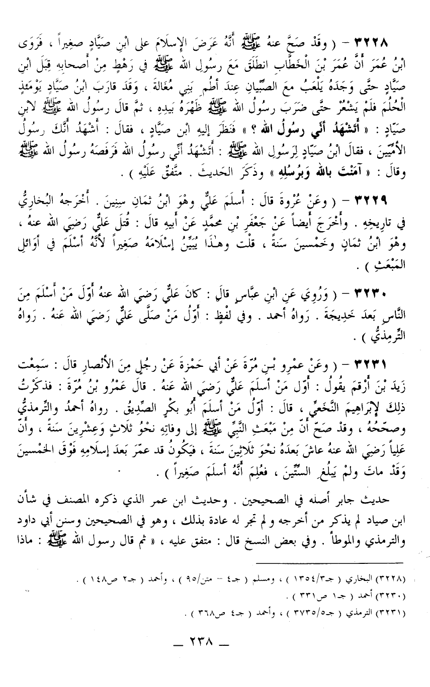 3228 - (وَقَدْ صَحَّ عَنْهُ - صَلَّى اللَّهُ عَلَيْهِ وَسَلَّمَ - «أَنَّهُ عَرَضَ الْإِسْلَامَ عَلَى ابْنِ صَيَّادٍ صَغِيرًا» ، فَرَوَى ابْنُ عُمَرَ «أَنَّ عُمَرَ بْنَ الْخَطَّابِ انْطَلَقَ مَعَ رَسُولِ اللَّهِ - صَلَّى اللَّهُ عَلَيْهِ وَسَلَّمَ - فِي رَهْطٍ مِنْ أَصْحَابِهِ قِبَلَ ابْنِ صَيَّادٍ حَتَّى وَجَدَهُ يَلْعَبُ مَعَ الصِّبْيَانِ عِنْدَ أُطُمِ بَنِي مَغَالَةَ، وَقَدْ قَارَبَ ابْنُ صَيَّادٍ يَوْمَئِذٍ الْحُلُمَ فَلَمْ يَشْعُرْ حَتَّى ضَرَبَ رَسُولُ اللَّهِ - صَلَّى اللَّهُ عَلَيْهِ وَسَلَّمَ - ظَهْرَهُ بِيَدِهِ، ثُمَّ قَالَ رَسُولُ اللَّهِ - صَلَّى اللَّهُ عَلَيْهِ وَسَلَّمَ - لِابْنِ صَيَّادٍ: أَتَشْهَدُ أَنِّي رَسُولُ اللَّهِ؟ فَنَظَرَ إلَيْهِ ابْنُ صَيَّادٍ، فَقَالَ: أَشْهَدُ أَنَّك رَسُولُ الْأُمِّيِّينَ، فَقَالَ ابْنُ صَيَّادٍ لِرَسُولِ اللَّهِ - صَلَّى اللَّهُ عَلَيْهِ وَسَلَّمَ -: أَتَشْهَدُ أَنِّي رَسُولُ اللَّهِ فَرَفَصَهُ رَسُولُ اللَّهِ - صَلَّى اللَّهُ عَلَيْهِ وَسَلَّمَ - وَقَالَ: آمَنْت بِاَللَّهِ وَبِرُسُلِهِ» وَذَكَرَ الْحَدِيثَ. مُتَّفَقٌ عَلَيْهِ) .