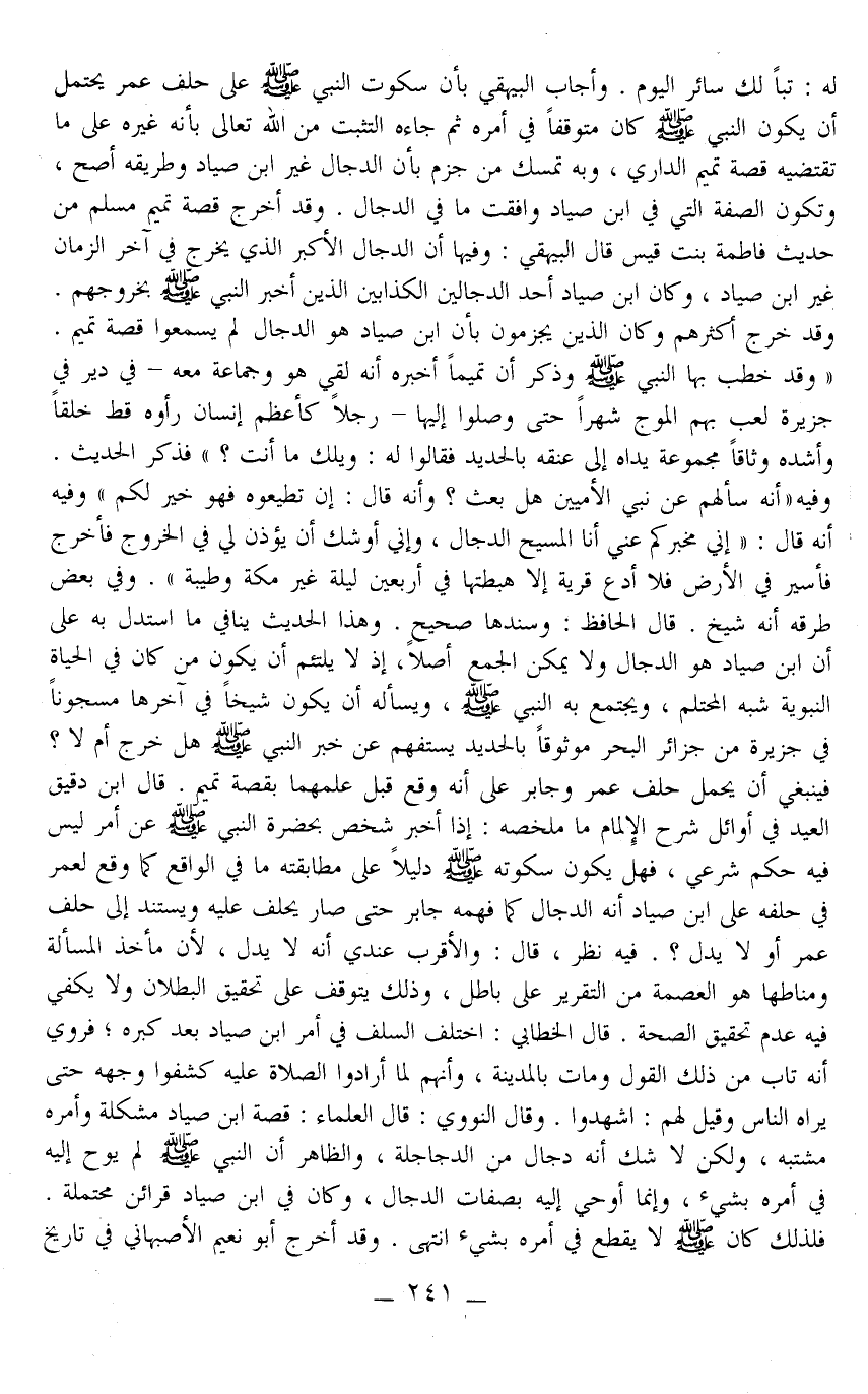 وَقَدْ أَخْرَجَ قِصَّةَ تَمِيمٍ مُسْلِمٌ مِنْ حَدِيثِ فَاطِمَةَ بِنْتِ قَيْسٍ قَالَ الْبَيْهَقِيُّ: وَفِيهَا أَنَّ الدَّجَّالَ الْأَكْبَرَ الَّذِي يَخْرُجُ فِي آخِرِ الزَّمَانِ غَيْرُ ابْنِ صَيَّادٍ، وَكَانَ ابْنُ صَيَّادٍ أَحَدَ الدَّجَّالِينَ الْكَذَّابِينَ الَّذِينَ أَخْبَرَ النَّبِيُّ - صَلَّى اللَّهُ عَلَيْهِ وَسَلَّمَ - بِخُرُوجِهِمْ. وَقَدْ خَرَجَ أَكْثَرُهُمْ. وَكَأَنَّ الَّذِينَ يَجْزِمُونَ بِأَنَّ ابْنَ صَيَّادٍ هُوَ الدَّجَّالُ لَمْ يَسْمَعُوا قِصَّةَ تَمِيمٍ. «وَقَدْ خَطَبَ بِهَا النَّبِيُّ - صَلَّى اللَّهُ عَلَيْهِ وَسَلَّمَ - وَذَكَرَ أَنَّ تَمِيمًا أَخْبَرَهُ أَنَّهُ لَقِيَ هُوَ وَجَمَاعَةٌ مَعَهُ - فِي دَيْرٍ فِي جَزِيرَةٍ لَعِبَ بِهِمْ الْمَوْجُ شَهْرًا حَتَّى وَصَلُوا إلَيْهَا - رَجُلًا كَأَعْظَمِ إنْسَانٍ رَأَوْهُ قَطُّ خَلْقًا وَأَشَدِّهِ وَثَاقًا مَجْمُوعَةٌ يَدَاهُ إلَى عُنُقِهِ بِالْحَدِيدِ فَقَالُوا لَهُ: وَيْلَك مَا أَنْتَ؟ فَذَكَرَ الْحَدِيثَ. وَفِيهِ أَنَّهُ سَأَلَهُمْ عَنْ نَبِيِّ الْأُمِّيِّينَ هَلْ بُعِثَ؟ وَأَنَّهُ قَالَ: إنْ تُطِيعُوهُ فَهُوَ خَيْرٌ لَكُمْ وَفِيهِ أَنَّهُ قَالَ: إنِّي مُخْبِرُكُمْ عَنِّي أَنَا الْمَسِيحُ الدَّجَّالُ، وَإِنِّي أُوشِكُ أَنْ يُؤْذَنَ لِي فِي الْخُرُوجِ فَأَخْرُجَ فَأَسِيرَ فِي الْأَرْضِ فَلَا أَدْعُ قَرْيَةً إلَّا هَبَطْتهَا فِي أَرْبَعِينَ لَيْلَةً غَيْرَ مَكَّةَ وَطَيْبَةَ» وَفِي بَعْضِ طُرُقِهِ أَنَّهُ شَيْخٌ. قَالَ الْحَافِظُ: وَسَنَدُهَا صَحِيحٌ. هَذَا الْحَدِيثُ يُنَافِي مَا اُسْتُدِلَّ بِهِ عَلَى أَنَّ ابْنَ صَيَّادٍ هُوَ الدَّجَّالُ وَلَا يُمْكِنُ الْجَمْعُ أَصْلًا، إذْ لَا يَلْتَئِمُ أَنْ يَكُونَ مَنْ كَانَ فِي الْحَيَاةِ النَّبَوِيَّةِ شِبْهَ الْمُحْتَلِمِ، وَيَجْتَمِعُ بِهِ النَّبِيُّ - صَلَّى اللَّهُ عَلَيْهِ وَسَلَّمَ -، وَيَسْأَلُهُ أَنْ يَكُونَ شَيْخًا فِي آخِرِهَا مَسْجُونًا فِي جَزِيرَةٍ مِنْ جَزَائِرِ الْبَحْرِ مَوْثُوقًا بِالْحَدِيدِ يَسْتَفْهِمُ عَنْ خَبَرِ النَّبِيِّ - صَلَّى اللَّهُ عَلَيْهِ وَسَلَّمَ - هَلْ خَرَجَ أَمْ لَا؟ فَيَنْبَغِي أَنْ يُحْمَلَ حَلِفُ عُمَرَ وَجَابِرٍ عَلَى أَنَّهُ وَقَعَ قَبْلَ عِلْمِهِمَا بِقِصَّةِ تَمِيمٍ.