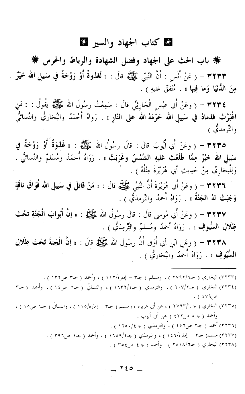 كِتَابُ الْجِهَادِ وَالسِّيَرِ بَابُ الْحَثِّ عَلَى الْجِهَاد وَفَضْل الشَّهَادَة وَالرِّبَاط وَالْحَرَس عَنْ أَنَسٍ: أَنَّ النَّبِيَّ - صَلَّى اللَّهُ عَلَيْهِ وَسَلَّمَ - قَالَ: «لَغَدْوَةٌ أَوْ رَوْحَةٌ فِي سَبِيلِ اللَّه خَيْرٌ مِنْ الدُّنْيَا وَمَا فِيهَا» . مُتَّفَق عَلَيْهِ) .