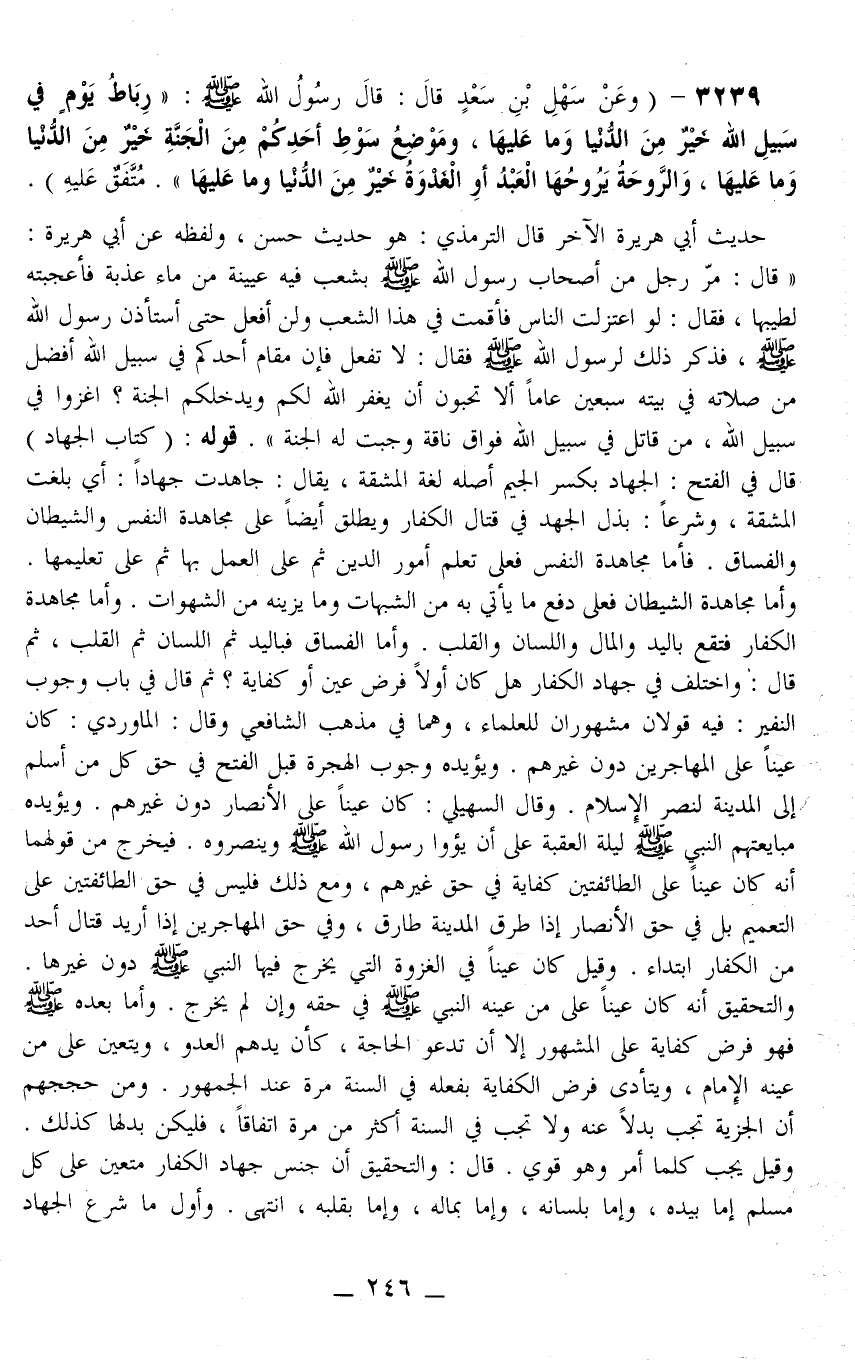 حَدِيثُ أَبِي هُرَيْرَةَ الْآخَرُ قَالَ التِّرْمِذِيُّ: هُوَ حَدِيثٌ حَسَنٌ، وَلَفْظُهُ عَنْ أَبِي هُرَيْرَةَ: قَالَ: «مَرَّ رَجُلٌ مِنْ أَصْحَابِ رَسُولِ اللَّهِ - صَلَّى اللَّهُ عَلَيْهِ وَسَلَّمَ - بِشِعْبٍ فِيهِ عُيَيْنَةَ مِنْ مَاءٍ عَذْبَةٍ فَأَعْجَبَتْهُ لِطِيبِهَا، فَقَالَ: لَوْ اعْتَزَلْت النَّاسَ فَأَقَمْت فِي هَذَا الشِّعْبِ وَلَنْ أَفْعَلَ حَتَّى أَسْتَأْذِنَ رَسُولَ اللَّهِ - صَلَّى اللَّهُ عَلَيْهِ وَسَلَّمَ -، فَذَكَرَ ذَلِكَ لِرَسُولِ اللَّهِ - صَلَّى اللَّهُ عَلَيْهِ وَسَلَّمَ - فَقَالَ: لَا تَفْعَلْ فَإِنَّ مُقَامَ أَحَدِكُمْ فِي سَبِيلِ اللَّهِ أَفْضَلُ مِنْ صَلَاتِهِ فِي بَيْتِهِ سَبْعِينَ عَامًا أَلَا تُحِبُّونَ أَنْ يَغْفِرَ اللَّهُ لَكُمْ وَيُدْخِلَكُمْ الْجَنَّةَ؟ اُغْزُوا فِي سَبِيلِ اللَّهِ، مَنْ قَاتَلَ فِي سَبِيلِ اللَّهِ فُوَاقَ نَاقَةٍ وَجَبَتْ لَهُ الْجَنَّةُ» . قَوْلُهُ: (كِتَابُ الْجِهَادِ) قَالَ فِي الْفَتْحِ: الْجِهَادُ بِكَسْرِ الْجِيمِ أَصْلُهُ لُغَةً الْمَشَقَّةُ، يُقَالُ: جَاهَدْت جِهَادًا: أَيْ بَلَغْت الْمَشَقَّةَ، وَشَرْعًا: بَذْلُ الْجُهْدِ فِي قِتَالِ الْكُفَّارِ وَيُطْلَقُ أَيْضًا عَلَى مُجَاهَدَةِ النَّفْسِ وَالشَّيْطَانِ وَالْفُسَّاقِ. فَأَمَّا مُجَاهَدَةُ النَّفْسِ فَعَلَى تَعَلُّمِ أُمُورِ الدِّينِ ثُمَّ عَلَى الْعَمَلِ بِهَا ثُمَّ عَلَى تَعْلِيمِهَا.