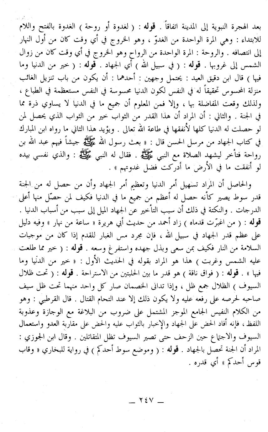 ـــــــــــــــــــــــــــــQبَعْدَ الْهِجْرَةِ النَّبَوِيَّةِ إلَى الْمَدِينَةِ اتِّفَاقًا. قَوْلُهُ: (لَغَدْوَةٌ أَوْ رَوْحَةٌ) الْغَدْوَةُ بِالْفَتْحِ، وَاللَّامُ لِلِابْتِدَاءِ: وَهِيَ الْمَرَّةُ الْوَاحِدَةُ مِنْ الْغُدُوِّ، وَهُوَ الْخُرُوجُ فِي أَيِّ وَقْتٍ كَانَ مِنْ أَوَّلِ النَّهَارِ إلَى انْتِصَافِهِ. وَالرَّوْحَةُ: الْمَرَّةُ الْوَاحِدَةُ مِنْ الرَّوَاحِ وَهُوَ الْخُرُوجُ فِي أَيِّ وَقْتٍ كَانَ مِنْ زَوَالِ الشَّمْسِ إلَى غُرُوبِهَا. قَوْلُهُ: (فِي سَبِيلِ اللَّهِ) أَيْ الْجِهَادِ. قَوْلُهُ: (خَيْرٌ مِنْ الدُّنْيَا وَمَا فِيهَا) قَالَ ابْنُ دَقِيقِ الْعِيدِ: يَحْتَمِلُ وَجْهَيْنِ: أَحَدُهُمَا: أَنْ يَكُونَ مِنْ بَابِ تَنْزِيلِ الْغَائِبِ مَنْزِلَةَ الْمَحْسُوسِ تَحْقِيقًا لَهُ فِي النَّفْسِ لِكَوْنِ الدُّنْيَا مَحْسُوسَةً فِي النَّفْسِ مُسْتَعْظَمَةً فِي الطِّبَاعِ، وَلِذَلِكَ وَقَعَتْ الْمُفَاضَلَةُ بِهَا، وَإِلَّا فَمِنْ الْمَعْلُومِ أَنَّ جَمِيعَ مَا فِي الدُّنْيَا لَا يُسَاوِي ذَرَّةً مِمَّا فِي الْجَنَّةِ. وَالثَّانِي: أَنَّ الْمُرَادَ أَنَّ هَذَا الْقَدْرَ مِنْ الثَّوَابِ خَيْرٌ مِنْ الثَّوَابِ الَّذِي يَحْصُلُ لِمَنْ لَوْ حَصَلَتْ لَهُ الدُّنْيَا كُلُّهَا لَأَنْفَقَهَا فِي طَاعَةِ اللَّهِ تَعَالَى. وَيُؤَيِّدُ هَذَا الثَّانِي مَا رَوَاهُ ابْنُ الْمُبَارَكِ فِي كِتَابِ الْجِهَادِ مِنْ مُرْسَلِ الْحَسَنِ قَالَ: «بَعَثَ رَسُولُ اللَّهِ - صَلَّى اللَّهُ عَلَيْهِ وَسَلَّمَ - جَيْشًا فِيهِمْ عَبْدُ اللَّهِ بْنُ رَوَاحَةَ فَتَأَخَّرَ لِيَشْهَدَ الصَّلَاةَ مَعَ النَّبِيِّ - صَلَّى اللَّهُ عَلَيْهِ وَسَلَّمَ -. فَقَالَ لَهُ النَّبِيُّ - صَلَّى اللَّهُ عَلَيْهِ وَسَلَّمَ -: وَاَلَّذِي نَفْسِي بِيَدِهِ لَوْ أَنْفَقْت مَا فِي الْأَرْضِ مَا أَدْرَكْت فَضْلَ غَدْوَتِهِمْ»