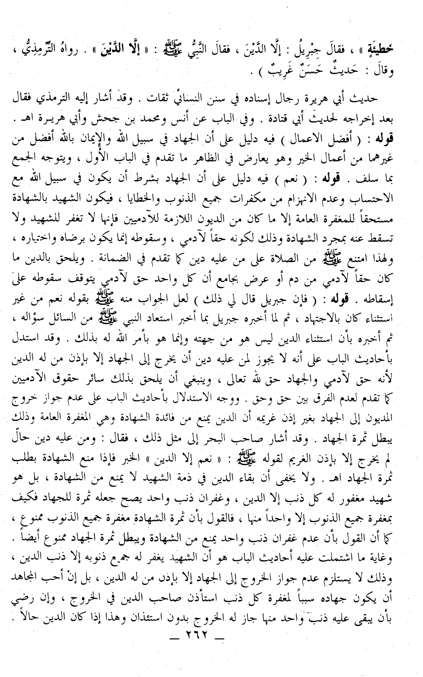 وَغَايَةُ مَا اشْتَمَلَتْ عَلَيْهِ أَحَادِيثُ الْبَابِ هُوَ أَنَّ الشَّهِيدَ يُغْفَرُ لَهُ جَمِيعُ ذُنُوبِهِ إلَّا ذَنْبَ الدَّيْنِ، وَذَلِكَ لَا يَسْتَلْزِمُ عَدَمَ جَوَازِ الْخُرُوجِ إلَى الْجِهَادِ إلَّا بِإِذْنِ مَنْ لَهُ الدَّيْنُ، بَلْ إنْ أَحَبَّ الْمُجَاهِدُ أَنْ يَكُونَ جِهَادُهُ سَبَبًا لِمَغْفِرَةِ كُلِّ ذَنْبٍ اسْتَأْذَنَ صَاحِبُ الدَّيْنِ فِي الْخُرُوجِ، وَإِنْ رَضِيَ بِأَنْ يَبْقَى عَلَيْهِ ذَنْبٌ وَاحِدٌ مِنْهَا جَازَ لَهُ الْخُرُوجُ بِدُونِ اسْتِئْذَانٍ وَهَذَا إذَا كَانَ الدَّيْنُ حَالًّا.