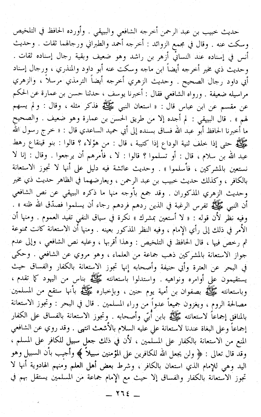 وَحَدِيثُ الزُّهْرِيِّ أَخْرَجَهُ أَيْضًا التِّرْمِذِيُّ مُرْسَلًا، وَالزُّهْرِيُّ مَرَاسِيلُهُ ضَعِيفَةٌ. وَرَوَاهُ الشَّافِعِيُّ فَقَالَ: أَخْبَرَنَا يُوسُفُ، حَدَّثَنَا حَسَنُ بْنُ عُمَارَةَ عَنْ الْحَكَمِ عَنْ مِقْسَمٍ عَنْ ابْنِ عَبَّاسٍ قَالَ: " اسْتَعَانَ النَّبِيّ - صَلَّى اللَّهُ عَلَيْهِ وَسَلَّمَ - فَذَكَرَ مِثْلَهُ، وَقَالَ: وَلَمْ يُسْهِمْ لَهُمْ ". قَالَ الْبَيْهَقِيُّ: لَمْ أَجِدْهُ إلَّا مِنْ طَرِيقِ الْحَسَنِ بْنِ عُمَارَةَ وَهُوَ ضَعِيفٌ. وَالصَّحِيحُ مَا أَخْبَرَنَا الْحَافِظُ أَبُو عَبْدِ اللَّهِ فَسَاقَ بِسَنَدِهِ إلَى أَبِي حُمَيْدٍ السَّاعِدِيِّ قَالَ: «خَرَجَ رَسُولُ اللَّهِ - صَلَّى اللَّهُ عَلَيْهِ وَسَلَّمَ - حَتَّى إذَا خَلَفَ ثَنِيَّةَ الْوَدَاعِ إذَا كَتِيبَةٌ، قَالَ: مَنْ هَؤُلَاءِ؟ قَالُوا: بَنُو قَيْنُقَاعِ رَهْطُ عَبْدِ اللَّهِ بْنِ سَلَامٍ، قَالَ: أَوْ تُسْلِمُوا؟ قَالُوا: لَا، فَأَمَرَهُمْ أَنْ يَرْجِعُوا. وَقَالَ: إنَّا لَا نَسْتَعِينُ بِالْمُشْرِكِينَ، فَأَسْلَمُوا» . وَحَدِيثُ عَائِشَةَ فِيهِ دَلِيلٌ عَلَى أَنَّهَا لَا تَجُوزُ الِاسْتِعَانَةُ بِالْكَافِرِ، وَكَذَلِكَ حَدِيثُ خُبَيْبِ بْنِ عَبْدِ الرَّحْمَنِ، وَيُعَارِضُهُمَا فِي الظَّاهِرِ حَدِيثُ ذِي مِخْبَرٍ وَحَدِيثُ الْأَزْهَرِيِّ الْمَذْكُورَانِ.