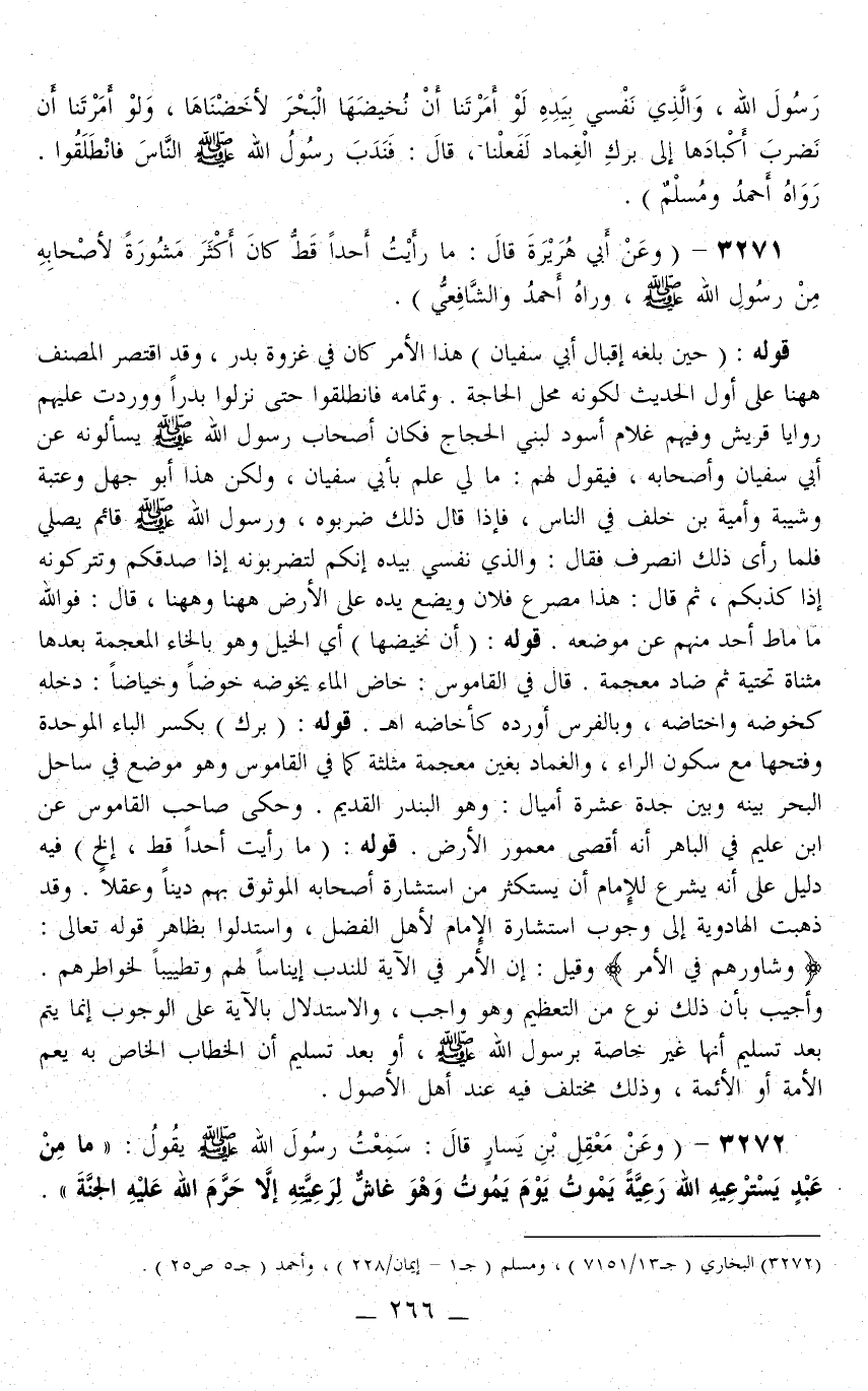 قَوْلُهُ: (أَنْ نُخِيضَهَا) أَيْ الْخَيْلَ وَهُوَ بِالْخَاءِ الْمُعْجَمَةِ بَعْدَهَا مُثَنَّاةٌ تَحْتِيَّةٌ ثُمَّ ضَادٌ مُعْجَمَةٌ. قَالَ فِي الْقَامُوسِ: خَاضَ الْمَاءَ يَخُوضُهُ خَوْضًا وَخِيَاضًا: دَخَلَهُ كَخَوَّضَهُ وَاخْتَاضَهُ، وَبِالْفَرَسِ أَوْرَدَهُ كَأَخَاضَهُ. قَوْلُهُ: (بِرْكِ) بِكَسْرِ الْبَاء الْمُوَحَّدَةِ وَفَتْحِهَا مَعَ سُكُونِ الرَّاءِ، وَالْغِمَادُ بِغَيْنٍ مُعْجَمَةٍ مُثَلَّثَةٍ كَمَا فِي الْقَامُوسِ وَهُوَ مَوْضِعٌ فِي سَاحِلِ الْبَحْرِ بَيْنَهُ وَبَيْنَ جُدَّةَ عَشْرَةُ أَمْيَالٍ: وَهُوَ الْبَنْدَرُ الْقَدِيمُ. وَحَكَى صَاحِبُ الْقَامُوسِ عَنْ ابْنِ عَلِيمٍ فِي الْبَاهِرِ أَنَّهُ أَقْصَى مَعْمُورِ الْأَرْضِ. قَوْلُهُ: (مَا رَأَيْت أَحَدًا قَطُّ. . . إلَخْ) فِيهِ دَلِيلٌ عَلَى أَنَّهُ يُشْرَعُ لِلْإِمَامِ أَنْ يَسْتَكْثِرَ مِنْ اسْتِشَارَةِ أَصْحَابِهِ الْمَوْثُوقِ بِهِمْ دِينًا وَعَقْلًا. وَقَدْ ذَهَبَتْ الْهَادَوِيَّةُ إلَى وُجُوبِ اسْتِشَارَةِ الْإِمَامِ لِأَهْلِ الْفَضْلِ، وَاسْتَدَلُّوا بِظَاهِرِ قَوْله تَعَالَى: {وَشَاوِرْهُمْ فِي الأَمْرِ} [آل عمران: 159] وَقِيلَ: إنَّ الْأَمْرَ فِي الْآيَةِ لِلنَّدْبِ إينَاسًا لَهُمْ وَتَطْيِيبًا لِخَوَاطِرِهِمْ. وَأُجِيبَ بِأَنَّ ذَلِكَ نَوْعٌ مِنْ التَّعْظِيمِ وَهُوَ وَاجِبٌ، وَالِاسْتِدْلَالُ بِالْآيَةِ عَلَى الْوُجُوبِ إنَّمَا يَتِمُّ بَعْدَ تَسْلِيمِ أَنَّهَا غَيْرُ خَاصَّةٍ بِرَسُولِ اللَّهِ - صَلَّى اللَّهُ عَلَيْهِ وَسَلَّمَ -، أَوْ بَعْدَ تَسْلِيمِ أَنَّ الْخِطَابَ الْخَاصَّ بِهِ يَعُمُّ الْأُمَّةَ أَوْ الْأَئِمَّةَ، وَذَلِكَ مُخْتَلَفٌ فِيهِ عِنْدَ أَهْلِ الْأُصُولِ