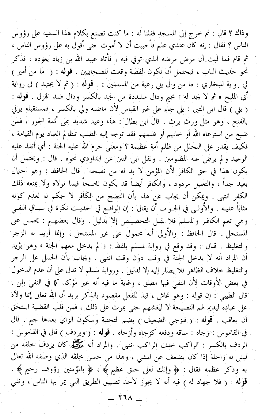 ـــــــــــــــــــــــــــــQوَذَاكَ؟ قَالَ: ثُمَّ خَرَجَ إلَى الْمَسْجِدِ فَقُلْنَا لَهُ: مَا كُنْتَ تَصْنَعُ بِكَلَامِ هَذَا السَّفِيهِ عَلَى رُءُوسِ النَّاسِ؟ فَقَالَ: إنَّهُ كَانَ عِنْدِي عِلْمٌ فَأَحْبَبْتُ أَنْ لَا أَمُوتَ حَتَّى أَقُولَ بِهِ عَلَى رُءُوسِ النَّاسِ، ثُمَّ قَامَ فَمَا لَبِثَ أَنْ مَرِضَ مَرَضَهُ الَّذِي تُوُفِّيَ فِيهِ، فَأَتَاهُ عُبَيْدُ اللَّهِ بْنُ زِيَادٍ يَعُودُهُ، فَذَكَرَ نَحْوَ حَدِيثِ الْبَابِ، فَيَحْتَمِلُ أَنْ تَكُونَ الْقِصَّةُ وَقَعَتْ لِلصَّحَابِيَّيْنِ. قَوْلُهُ: (مَا مِنْ أَمِيرٍ) فِي رِوَايَةٍ لِلْبُخَارِيِّ " مَا مِنْ وَالٍ يَلِي رَعِيَّةً مِنْ الْمُسْلِمِينَ ".