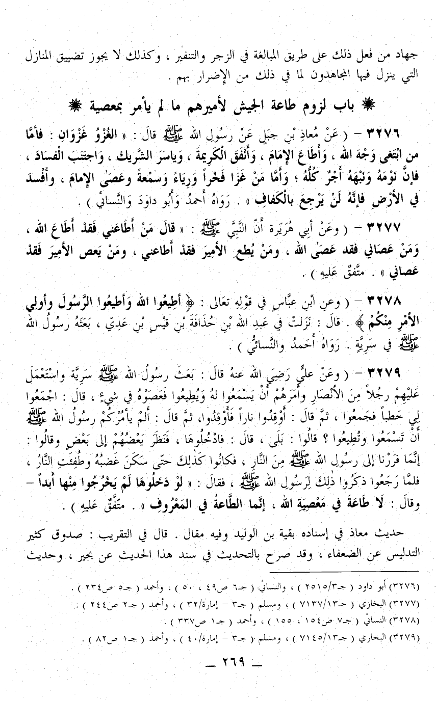 3279 - (وَعَنْ عَلِيٍّ - رَضِيَ اللَّهُ عَنْهُ - قَالَ: «بَعَثَ رَسُولُ اللَّهِ - صَلَّى اللَّهُ عَلَيْهِ وَسَلَّمَ - سَرِيَّةً وَاسْتَعْمَلَ عَلَيْهِمْ رَجُلًا مِنْ الْأَنْصَارِ وَأَمَرَهُمْ أَنْ يَسْمَعُوا لَهُ وَيُطِيعُوا فَعَصَوْهُ فِي شَيْءٍ: قَالَ: اجْمَعُوا لِي حَطَبًا فَجَمَعُوا، ثُمَّ قَالَ: أَوْقِدُوا نَارًا فَأَوْقَدُوا، ثُمَّ قَالَ: أَلَمْ يَأْمُرْكُمْ رَسُولُ اللَّهِ - صَلَّى اللَّهُ عَلَيْهِ وَسَلَّمَ - أَنْ تَسْمَعُوا وَتُطِيعُوا؟ قَالُوا: بَلَى، قَالَ: فَادْخُلُوهَا، فَنَظَرَ بَعْضُهُمْ إلَى بَعْضٍ وَقَالُوا: إنَّمَا فَرَرْنَا إلَى رَسُولِ اللَّهِ - صَلَّى اللَّهُ عَلَيْهِ وَسَلَّمَ - مِنْ النَّارِ، فَكَانُوا كَذَلِكَ حَتَّى سَكَنَ غَضَبُهُ وَطُفِئَتْ النَّارُ، فَلَمَّا رَجَعُوا ذَكَرُوا ذَلِكَ لِرَسُولِ اللَّهِ - صَلَّى اللَّهُ عَلَيْهِ وَسَلَّمَ -، فَقَالَ: لَوْ دَخَلُوهَا لَمْ يَخْرُجُوا مِنْهَا أَبَدًا - وَقَالَ: لَا طَاعَةَ فِي مَعْصِيَةِ اللَّهِ، إنَّمَا الطَّاعَةُ فِي الْمَعْرُوفِ» . مُتَّفَقٌ عَلَيْهِ) .