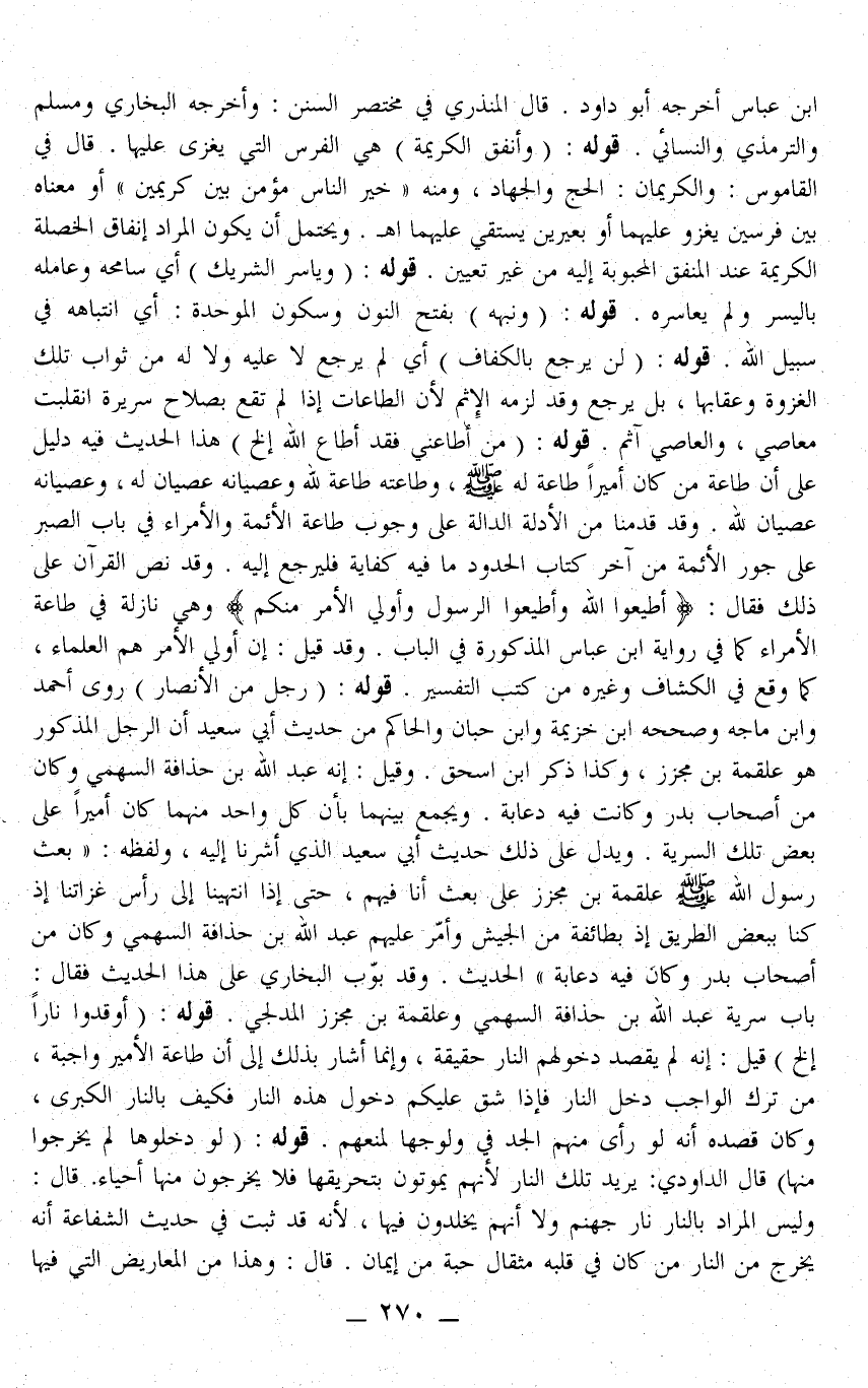 ـــــــــــــــــــــــــــــQابْنِ عَبَّاسٍ أَخْرَجَهُ أَبُو دَاوُد. قَالَ الْمُنْذِرِيُّ فِي مُخْتَصَرِ السُّنَنِ: وَأَخْرَجَهُ الْبُخَارِيُّ وَمُسْلِمٌ وَالتِّرْمِذِيُّ وَالنَّسَائِيُّ. قَوْلُهُ: (وَأَنْفَقَ الْكَرِيمَةَ) هِيَ الْفَرَسُ الَّتِي يُغْزَى عَلَيْهَا. قَالَ فِي الْقَامُوسِ: وَالْكَرِيمَانِ: الْحَجُّ وَالْجِهَادُ، وَمِنْهُ " خَيْرُ النَّاسِ مُؤْمِنٌ بَيْن كَرِيمَيْنِ " أَوْ مَعْنَاهُ بَيْنَ فَرَسَيْنِ يَغْزُو عَلَيْهِمَا أَوْ بَعِيرَيْنِ يَسْتَقِي عَلَيْهِمَا. وَيَحْتَمِلُ أَنْ يَكُونَ الْمُرَادُ إنْفَاقُ الْخَصْلَةِ الْكَرِيمَةِ عِنْدَ الْمُنْفِقِ الْمَحْبُوبَةِ إلَيْهِ مِنْ غَيْرِ تَعْيِينٍ. قَوْلُهُ: (وَيَاسَرَ الشَّرِيكَ) أَيْ سَامَحَهُ وَعَامَلَهُ بِالْيُسْرِ وَلَمْ يُعَاسِرْهُ. قَوْلُهُ: (وَنَبْهُهُ) بِفَتْحِ النُّونِ وَسُكُونِ الْمُوَحَّدَةِ: أَيْ انْتِبَاهُهُ فِي سَبِيلِ اللَّهِ. قَوْلُهُ: (لَنْ يَرْجِعَ بِالْكَفَافِ) أَيْ لَمْ يَرْجِعْ لَا عَلَيْهِ وَلَا لَهُ مِنْ ثَوَابِ تِلْكَ الْغَزْوَةِ وَعِقَابِهَا، بَلْ يَرْجِعُ وَقَدْ لَزِمَهُ الْإِثْمُ لِأَنَّ الطَّاعَاتِ إذَا لَمْ تَقَعْ بِصَلَاحِ سَرِيرَةٍ انْقَلَبَتْ مَعَاصِيَ، وَالْعَاصِي آثِمٌ. قَوْلُهُ: (مَنْ أَطَاعَنِي فَقَدْ أَطَاعَ اللَّهَ. . . إلَخْ) هَذَا الْحَدِيثُ فِيهِ دَلِيلٌ عَلَى أَنَّ طَاعَةَ مَنْ كَانَ أَمِيرًا طَاعَةٌ لَهُ - صَلَّى اللَّهُ عَلَيْهِ وَسَلَّمَ -، وَطَاعَتُهُ طَاعَةٌ لِلَّهِ وَعِصْيَانُهُ عِصْيَانٌ لَهُ، وَعِصْيَانُهُ عِصْيَانٌ لِلَّهِ. وَقَدْ قَدَّمْنَا مِنْ الْأَدِلَّةِ الدَّالَّةِ عَلَى وُجُوبِ طَاعَةِ الْأَئِمَّةِ وَالْأُمَرَاءِ فِي بَابِ الصَّبْرِ عَلَى جَوْرِ الْأَئِمَّةِ مِنْ آخِرِ كِتَابِ الْحُدُودِ مَا فِيهِ كِفَايَةٌ فَلْيُرْجَعْ إلَيْهِ