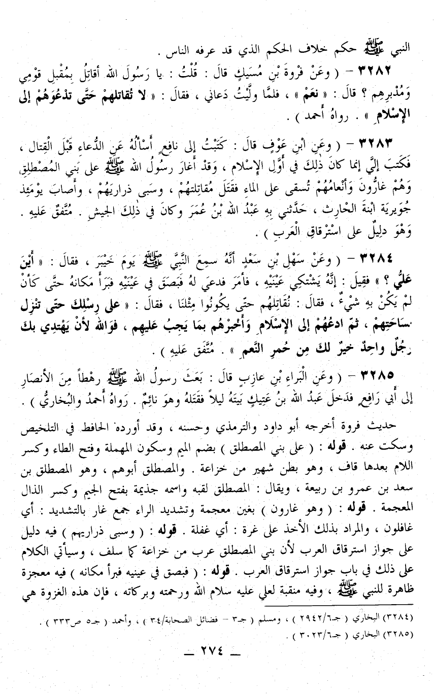 3285 - (وَعَنْ الْبَرَاءِ بْنِ عَازِبٍ قَالَ: «بَعَثَ رَسُولُ اللَّهِ - صَلَّى اللَّهُ عَلَيْهِ وَسَلَّمَ - رَهْطًا مِنْ الْأَنْصَارِ إلَى أَبِي رَافِعٍ فَدَخَلَ عَبْدُ اللَّهِ بْنُ عَتِيكٍ بَيْتَهُ لَيْلًا فَقَتَلَهُ وَهُوَ نَائِمٌ» . رَوَاهُ أَحْمَدُ وَالْبُخَارِيُّ) . حَدِيثُ فَرْوَةَ أَخْرَجَهُ أَبُو دَاوُد وَالتِّرْمِذِيُّ وَحَسَّنَهُ، وَقَدْ أَوْرَدَهُ الْحَافِظُ فِي التَّلْخِيصِ وَسَكَتَ عَنْهُ. قَوْلُهُ: (عَلَى بَنِي الْمُصْطَلِقِ) بِضَمِّ الْمِيمِ وَسُكُونِ الْمُهْمَلَةِ وَفَتْحِ الطَّاءِ وَكَسْرِ اللَّامِ بَعْدَهَا قَافٌ، وَهُوَ بَطْنٌ شَهِيرٌ مِنْ خُزَاعَةَ. وَالْمُصْطَلِقُ أَبُوهُمْ، وَهُوَ الْمُصْطَلِقُ بْنُ سَعْدِ بْنِ عَمْرِو بْنِ رَبِيعَةَ، وَيُقَالُ: الْمُصْطَلِقُ لَقَبُهُ وَاسْمُهُ جَذِيمَةُ بِفَتْحِ الْجِيمِ وَكَسْرِ الذَّالِ الْمُعْجَمَةِ. قَوْلُهُ: (وَهُمْ غَارُّونَ) بِغَيْنٍ مُعْجَمَةٍ وَتَشْدِيدِ الرَّاءِ جَمْعُ غَارٍّ بِالتَّشْدِيدِ: أَيْ غَافِلُونَ، وَالْمُرَادُ بِذَلِكَ الْأَخْذُ عَلَى غِرَّةٍ: أَيْ غَفْلَةٍ. قَوْلُهُ: (وَسَبَى ذَرَارِيَّهُمْ) فِيهِ دَلِيلٌ عَلَى جَوَازِ اسْتِرْقَاقِ الْعَرَبِ لِأَنَّ بَنِي الْمُصْطَلِقِ عَرَبٌ مِنْ خُزَاعَةَ كَمَا سَلَفَ، وَسَيَأْتِي الْكَلَامُ عَلَى ذَلِكَ فِي بَابِ جَوَازِ اسْتِرْقَاقِ الْعَرَبِ.