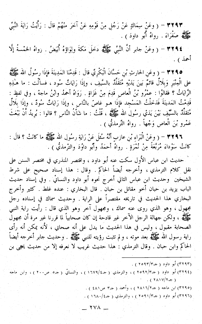 3294 - (وَعَنْ جَابِرٍ أَنَّ النَّبِيَّ - صَلَّى اللَّهُ عَلَيْهِ وَسَلَّمَ - «دَخَلَ مَكَّةَ وَلِوَاؤُهُ أَبْيَضُ» . رَوَاهُ الْخَمْسَةُ إلَّا أَحْمَدَ) .