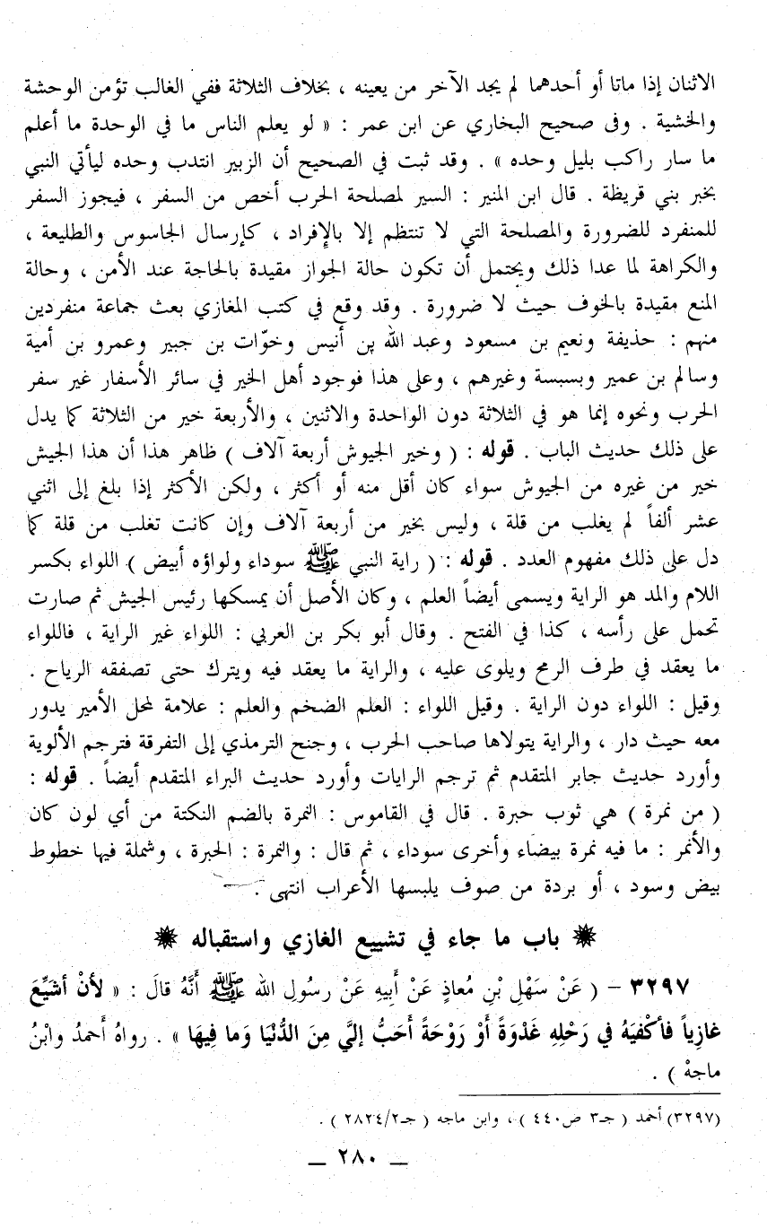 3297 - (عَنْ سَهْلِ بْنِ مُعَاذٍ عَنْ أَبِيهِ عَنْ رَسُولِ اللَّهِ - صَلَّى اللَّهُ عَلَيْهِ وَسَلَّمَ - أَنَّهُ قَالَ: «لَأَنْ أُشَيِّعَ غَازِيًا فَأَكْفِيَهُ فِي رَحْلَهُ غَدْوَةً أَوْ رَوْحَةً أَحَبُّ إلَيَّ مِنْ الدُّنْيَا وَمَا فِيهَا» . رَوَاهُ أَحْمَدُ وَابْنُ مَاجَهْ) .