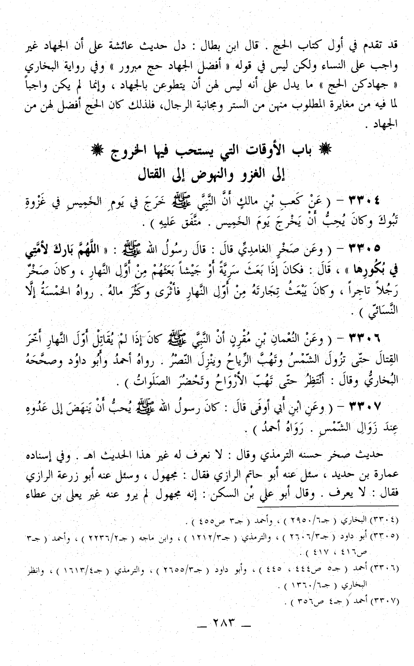 3306 - (وَعَنْ النُّعْمَانِ بْنِ مُقَرِّنٍ «أَنَّ النَّبِيَّ - صَلَّى اللَّهُ عَلَيْهِ وَسَلَّمَ - كَانَ إذَا لَمْ يُقَاتِلْ أَوَّلَ النَّهَارِ أَخَّرَ الْقِتَالَ حَتَّى تَزُولَ الشَّمْسُ وَتَهُبَّ الرِّيَاحُ وَيَنْزِلَ النَّصْرُ» . رَوَاهُ أَحْمَدُ وَأَبُو دَاوُد وَصَحَّحَهُ الْبُخَارِيُّ وَقَالَ: انْتَظَرَ حَتَّى تَهُبَّ الْأَرْوَاحُ وَتَحْضُرَ الصَّلَوَاتُ) .