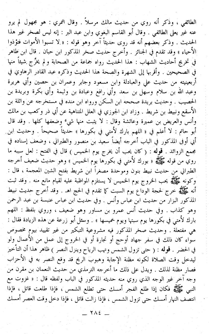 وَفِي حَدِيثِ أَنَسٍ عَمْرُو بْنُ مُسَاوِرٍ وَهُوَ ضَعِيفٌ، وَرُوِيَ بِلَفْظِ: «اللَّهُمَّ بَارِكْ لِأُمَّتِي فِي بُكُورِهَا يَوْمَ سَبْتِهَا وَيَوْمَ خَمِيسِهَا» وَسُئِلَ أَبُو زُرْعَةَ عَنْ هَذِهِ الزِّيَادَةِ فَقَالَ: هِيَ مُفْتَعَلَةٌ. وَحَدِيثُ صَخْرٍ الْمَذْكُورُ فِيهِ مَشْرُوعِيَّةُ التَّبْكِيرِ مِنْ غَيْرِ تَقْيِيدٍ بِيَوْمٍ مَخْصُوصٍ سَوَاءٌ كَانَ ذَلِكَ فِي سَفَرِ جِهَادٍ أَوْ حَجٍّ أَوْ تِجَارَةٍ أَوْ فِي الْخُرُوجِ إلَى عَمَلٍ مِنْ الْأَعْمَالِ وَلَوْ فِي الْحَضَرِ. قَوْلُهُ: (حَتَّى تَزُولَ الشَّمْسُ وَتَهُبَّ الرِّيَاحُ وَيَنْزِلَ النَّصْرُ) ظَاهِرُ هَذَا أَنَّ التَّأْخِيرَ لِيَدْخُلَ وَقْتُ الصَّلَاةِ لِكَوْنِهِ مَظِنَّةُ الْإِجَابَةِ وَهُبُوبُ الرِّيحِ قَدْ وَقَعَ النَّصْرُ بِهِ فِي الْأَحْزَابِ فَصَارَ مَظِنَّةً لِذَلِكَ. وَيَدُلُّ عَلَى ذَلِكَ مَا أَخْرَجَهُ التِّرْمِذِيُّ مِنْ حَدِيثِ النُّعْمَانِ بْنِ مُقَرِّنٍ مِنْ وَجْهٍ آخَرَ غَيْرِ الْوَجْهِ الَّذِي رُوِيَ مِنْهُ حَدِيثُهُ الْمَذْكُورُ فِي الْبَابِ وَلَفْظُهُ قَالَ: «غَزَوْتُ مَعَ النَّبِيِّ - صَلَّى اللَّهُ عَلَيْهِ وَسَلَّمَ - فَكَانَ إذَا طَلَعَ الْفَجْرُ أَمْسَكَ حَتَّى تَطْلُعَ الشَّمْسُ، فَإِذَا طَلَعَتْ قَاتَلَ، فَإِذَا انْتَصَفَ النَّهَارُ أَمْسَكَ حَتَّى تَزُولَ الشَّمْسُ، فَإِذَا زَالَتْ قَاتَلَ، فَإِذَا دَخَلَ وَقْتُ الْعَصْرِ أَمْسَكَ