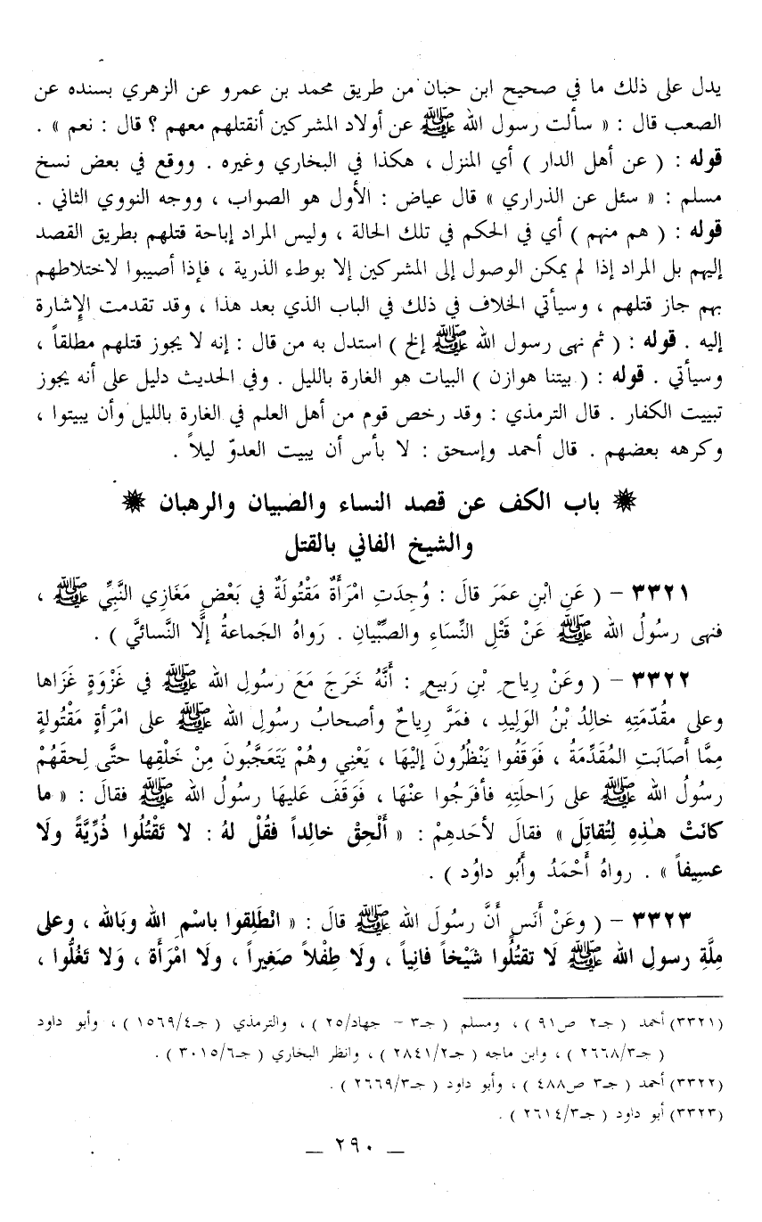3321 - (عَنْ ابْنِ عُمَرَ قَالَ: «وُجِدَتْ امْرَأَةٌ مَقْتُولَةٌ فِي بَعْضِ مَغَازِي النَّبِيِّ - صَلَّى اللَّهُ عَلَيْهِ وَسَلَّمَ -، فَنَهَى رَسُولُ اللَّهِ - صَلَّى اللَّهُ عَلَيْهِ وَسَلَّمَ - عَنْ قَتْلِ النِّسَاءِ وَالصِّبْيَانِ» . رَوَاهُ الْجَمَاعَةُ إلَّا النَّسَائِيّ) .