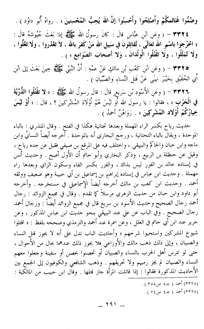 3325 - (وَعَنْ ابْنِ كَعْبِ بْنِ مَالِكٍ عَنْ عَمِّهِ: «أَنَّ النَّبِيَّ - صَلَّى اللَّهُ عَلَيْهِ وَسَلَّمَ - حِينَ بَعَثَ إلَى ابْنِ أَبِي الْحَقِيقِ بِخَيْبَرَ نَهَى عَنْ قَتْلِ النِّسَاءِ وَالصِّبْيَانِ» ) .