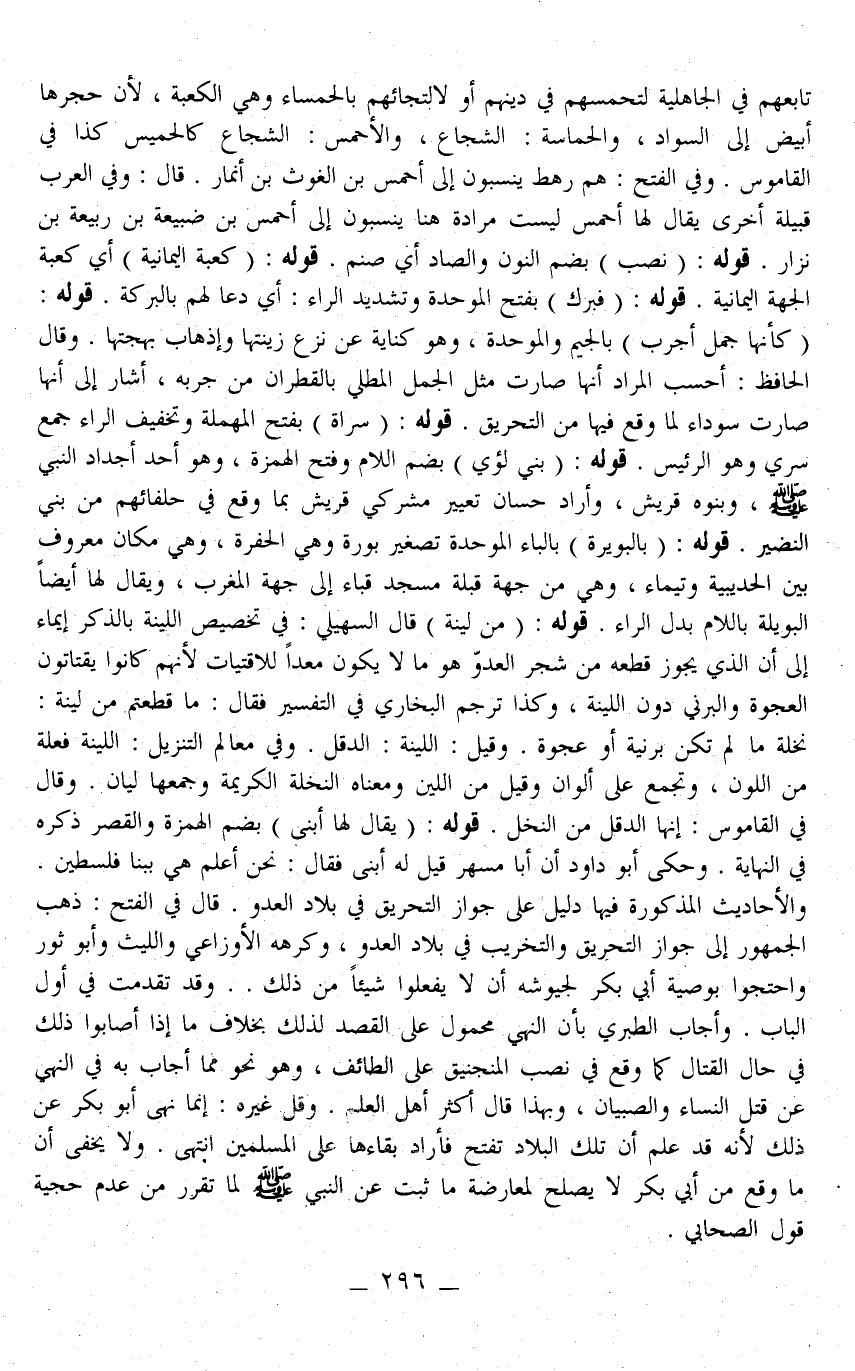 وَفِي مَعَالِمِ التَّنْزِيلِ: اللِّينَةُ فِعْلَةٌ مِنْ اللَّوْنِ، وَتُجْمَعُ عَلَى أَلْوَانٍ وَقِيلَ مِنْ اللِّينِ وَمَعْنَاهُ النَّخْلَةُ الْكَرِيمَةُ وَجَمْعُهَا لِيَانٌ. وَقَالَ فِي الْقَامُوسِ: إنَّهَا الدَّقَلُ مِنْ النَّخْلِ. قَوْلُهُ: (يُقَالُ لَهَا أُبْنَى) بِضَمِّ الْهَمْزَةِ وَالْقَصْرِ ذَكَرَهُ فِي النِّهَايَةِ. وَحَكَى أَبُو دَاوُد أَنَّ أَبَا مُسْهِرٍ قِيلَ لَهُ أُبْنَى فَقَالَ: نَحْنُ أَعْلَمُ هِيَ بُبْنَا فِلَسْطِينَ. وَالْأَحَادِيثُ الْمَذْكُورَةُ فِيهَا دَلِيلٌ عَلَى جَوَازِ التَّحْرِيقِ فِي بِلَادِ الْعَدُوِّ. قَالَ فِي الْفَتْحِ: ذَهَبَ الْجُمْهُورِ إلَى جَوَازِ التَّحْرِيقِ وَالتَّخْرِيبِ فِي بِلَادِ الْعَدُوِّ، وَكَرِهَهُ الْأَوْزَاعِيُّ وَاللَّيْثُ وَأَبُو ثَوْرٍ وَاحْتَجُّوا بِوَصِيَّةِ أَبِي بَكْرٍ لِجُيُوشِهِ أَنْ لَا يَفْعَلُوا شَيْئًا مِنْ ذَلِكَ وَقَدْ تَقَدَّمَتْ فِي أَوَّلِ الْبَابِ. وَأَجَابَ الطَّبَرِيُّ بِأَنَّ النَّهْيَ مَحْمُولٌ عَلَى الْقَصْدِ لِذَلِكَ بِخِلَافِ مَا إذَا أَصَابُوا ذَلِكَ فِي حَالِ الْقِتَالِ كَمَا وَقَعَ فِي نَصْبِ الْمَنْجَنِيقِ عَلَى الطَّائِفِ، وَهُوَ نَحْوٌ مِمَّا أَجَابَ بِهِ فِي النَّهْيِ عَنْ قَتْلِ النِّسَاءِ وَالصِّبْيَانِ، وَبِهَذَا قَالَ أَكْثَرُ أَهْلِ الْعِلْمِ.