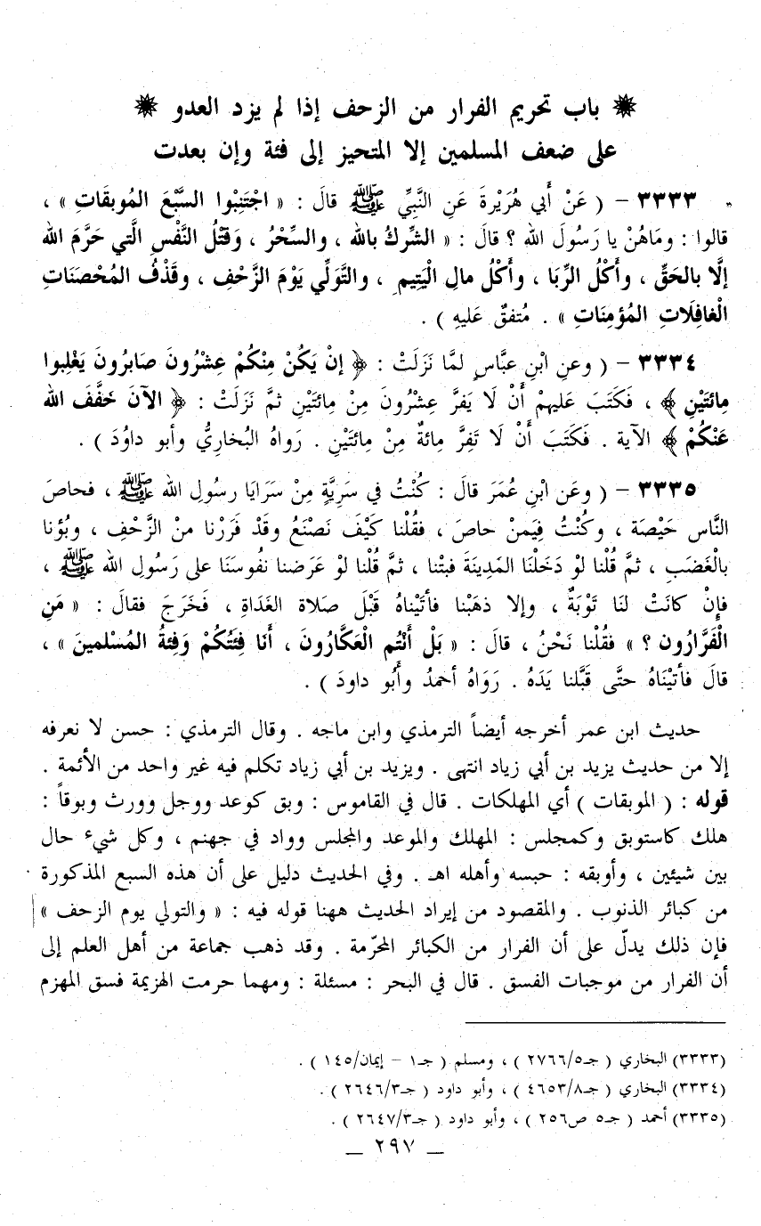 وَفِي الْحَدِيثِ دَلِيلٌ عَلَى أَنَّ هَذِهِ السَّبْعَ الْمَذْكُورَةَ مِنْ كَبَائِرِ الذُّنُوبِ. وَالْمَقْصُودُ مِنْ إيرَادِ الْحَدِيثِ هَهُنَا قَوْلُهُ فِيهِ: " وَالتَّوَلِّي يَوْمَ الزَّحْفِ " فَإِنَّ ذَلِكَ يَدُلُّ عَلَى أَنَّ الْفِرَارَ مِنْ الْكَبَائِرِ الْمُحَرَّمَةِ. وَقَدْ ذَهَبَ جَمَاعَةٌ مِنْ أَهْلِ الْعِلْمِ إلَى أَنَّ الْفِرَارَ مِنْ مُوجِبَاتِ الْفِسْقِ. قَالَ فِي الْبَحْرِ: مَسْأَلَةٌ: وَمَهْمَا حُرِّمَتْ الْهَزِيمَةُ فُسِّقَ الْمُنْهَزِمُ