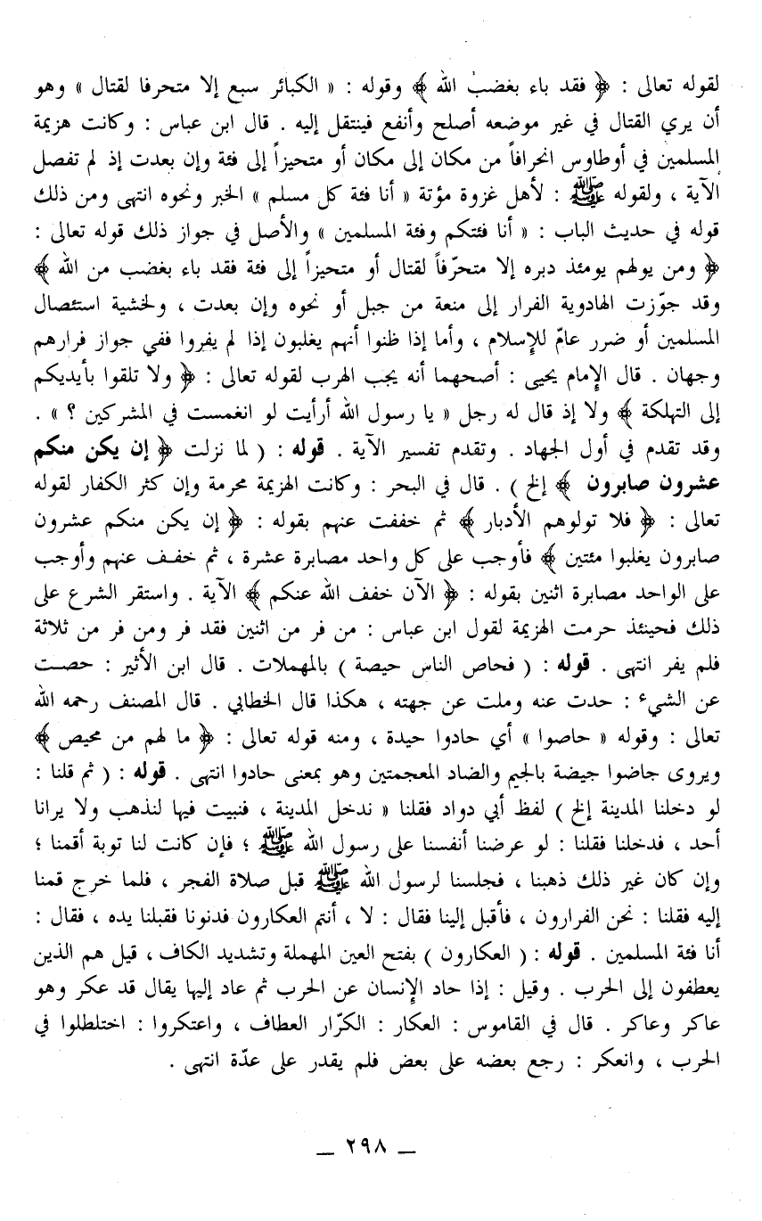 قَالَ فِي الْبَحْرِ: وَكَانَتْ الْهَزِيمَةُ مُحَرَّمَةً وَإِنْ كَثُرَ الْكُفَّارُ لِقَوْلِهِ تَعَالَى: {فَلا تُوَلُّوهُمُ الأَدْبَارَ} [الأنفال: 15] ثُمَّ خُفِّفَتْ عَنْهُمْ بِقَوْلِهِ: {إِنْ يَكُنْ مِنْكُمْ عِشْرُونَ صَابِرُونَ يَغْلِبُوا مِائَتَيْنِ} [الأنفال: 65] فَأَوْجَبَ عَلَى كُلِّ وَاحِدٍ مُصَابَرَةَ عَشَرَةٍ، ثُمَّ خَفَّفَ عَنْهُمْ وَأَوْجَبَ عَلَى الْوَاحِدِ مُصَابَرَةَ اثْنَيْنِ بِقَوْلِهِ: {الآنَ خَفَّفَ اللَّهُ عَنْكُمْ} [الأنفال: 66] الْآيَةُ. وَاسْتَقَرَّ الشَّرْعُ عَلَى ذَلِكَ فَحِينَئِذٍ حُرِّمَتْ الْهَزِيمَةُ لِقَوْلِ ابْنِ عَبَّاسٍ: مَنْ فَرَّ مِنْ اثْنَيْنِ فَقَدْ فَرَّ وَمَنْ فَرَّ مِنْ ثَلَاثَةٍ فَلَمْ يَفِرَّ. انْتَهَى
