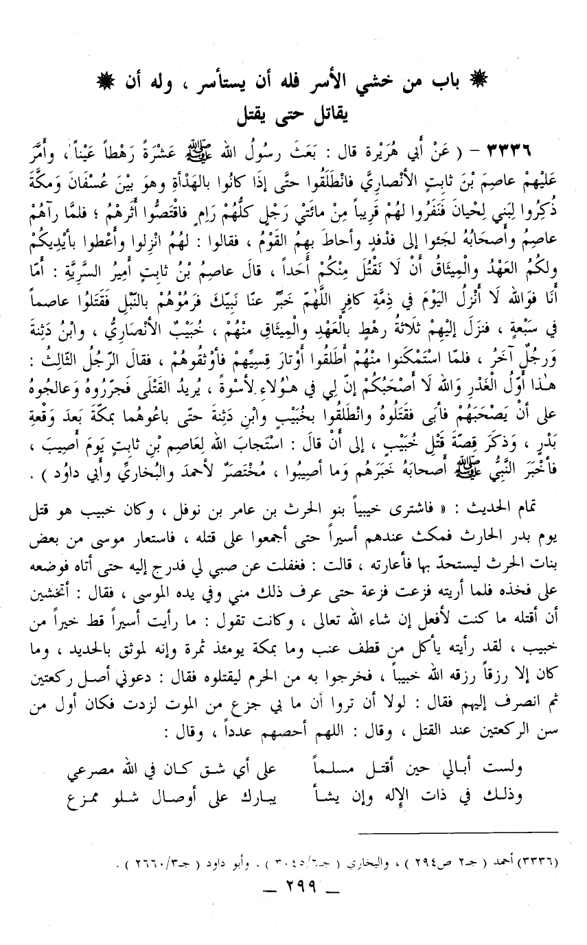 عَنْ أَبِي هُرَيْرَةَ قَالَ: «بَعَثَ رَسُولُ اللَّهِ - صَلَّى اللَّهُ عَلَيْهِ وَسَلَّمَ - عَشَرَةَ رَهْطٍ عَيْنًا، وَأَمَّرَ عَلَيْهِمْ عَاصِمَ بْنَ ثَابِتٍ الْأَنْصَارِيَّ فَانْطَلَقُوا حَتَّى إذَا كَانُوا بِالْهَدْأَةِ وَهُوَ بَيْنَ عُسْفَانَ وَمَكَّةَ ذُكِرُوا لِبَنِي لِحْيَانَ فَنَفَرُوا لَهُمْ قَرِيبًا مِنْ مِائَتَيْ رَجُلٍ كُلُّهُمْ رَامٍ فَاقْتَصُّوا أَثَرَهُمْ فَلَمَّا رَآهُمْ عَاصِمٌ وَأَصْحَابُهُ لَجَئُوا إلَى فَدْفَدٍ وَأَحَاطَ بِهِمْ الْقَوْمُ، فَقَالُوا لَهُمْ: انْزِلُوا وَأَعْطُوا بِأَيْدِيكُمْ وَلَكُمْ الْعَهْدُ وَالْمِيثَاقُ أَنْ لَا نَقْتُلَ مِنْكُمْ أَحَدًا، قَالَ عَاصِمُ بْنُ ثَابِتٍ أَمِيرُ السَّرِيَّةِ: أَمَّا أَنَا فَوَاَللَّهِ لَا أَنْزِلُ الْيَوْمَ فِي ذِمَّةِ كَافِرٍ، اللَّهُمَّ خَبِّرْ عَنَّا نَبِيَّكَ، فَرَمَوْهُمْ بِالنَّبْلِ فَقَتَلُوا عَاصِمًا فِي سَبْعَةٍ، فَنَزَلَ إلَيْهِمْ ثَلَاثَةُ رَهْطٍ بِالْعَهْدِ وَالْمِيثَاقِ مِنْهُمْ، خُبَيْبِ الْأَنْصَارِيُّ، وَابْنُ دَثِنَةَ وَرَجُلٌ آخَرُ، فَلَمَّا اسْتَمْكَنُوا مِنْهُمْ أَطْلَقُوا أَوْتَارَ قِسِيِّهِمْ فَأَوْثَقُوهُمْ، فَقَالَ الرَّجُلُ الثَّالِثُ: هَذَا أَوَّلُ الْغَدْرِ، وَاَللَّهِ لَا أَصْحَبُكُمْ إنَّ لِي فِي هَؤُلَاءِ لَأُسْوَةً، يُرِيدُ الْقَتْلَى، فَجَرَّرُوهُ وَعَالَجُوهُ عَلَى أَنْ يَصْحَبَهُمْ فَأَبَى فَقَتَلُوهُ وَانْطَلَقُوا بِخُبَيْبٍ وَابْنِ دَثِنَةَ حَتَّى بَاعُوهُمَا بِمَكَّةَ بَعْدَ وَقْعَةِ بَدْرٍ، وَذَكَرَ قِصَّةَ قَتْلِ خُبَيْبِ، إلَى أَنْ قَالَ: اسْتَجَابَ اللَّهُ لِعَاصِمِ بْنِ ثَابِتٍ يَوْمَ أُصِيبَ، فَأَخْبَرَ النَّبِيُّ أَصْحَابَهُ - صَلَّى اللَّهُ عَلَيْهِ وَسَلَّمَ - خَبَرَهُمْ وَمَا أُصِيبُوا» ، مُخْتَصَرٌ لِأَحْمَدَ وَالْبُخَارِيِّ وَأَبِي دَاوُد) .
