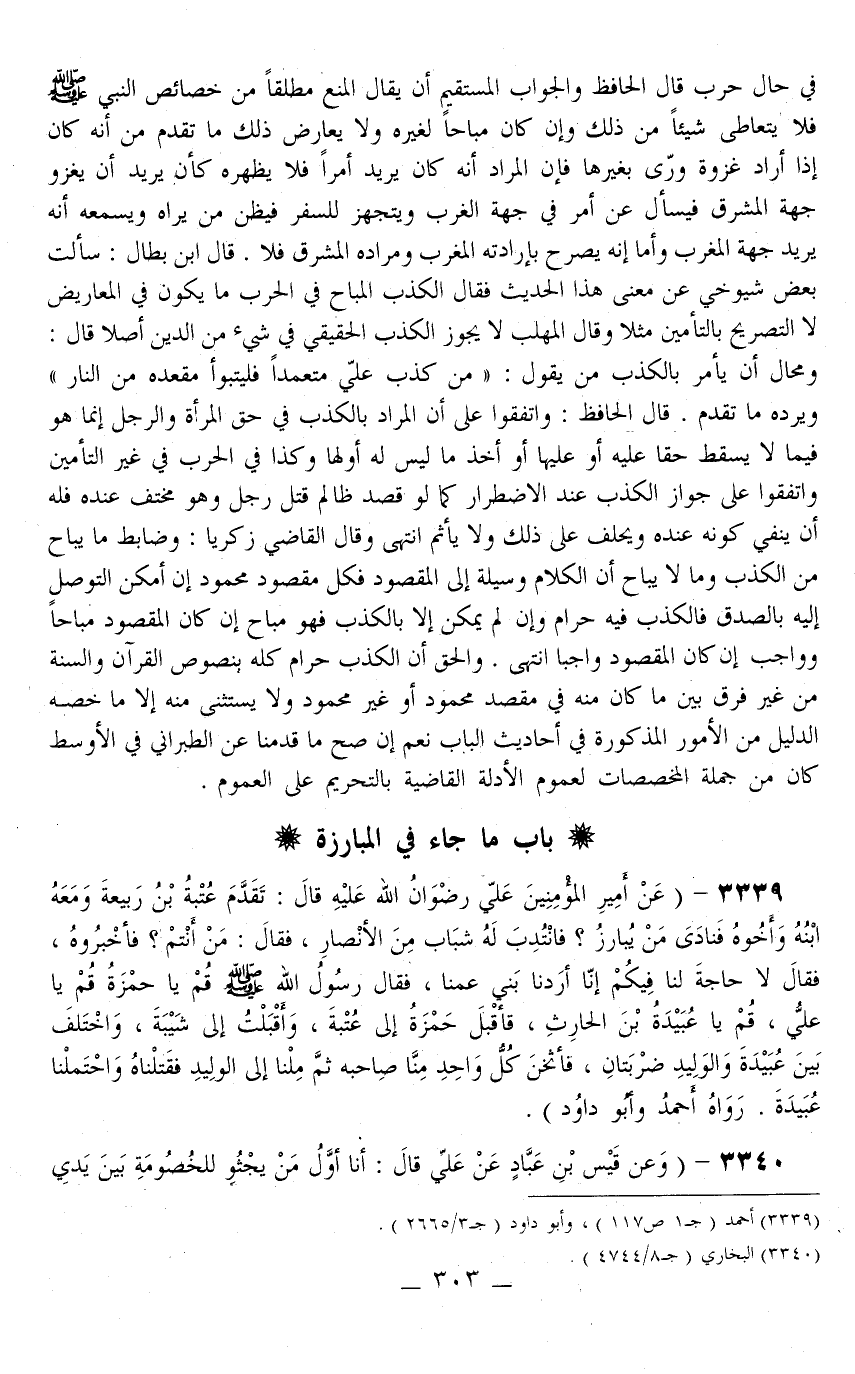 ـــــــــــــــــــــــــــــQفِي حَالِ حَرْبٍ قَالَ الْحَافِظُ وَالْجَوَابُ الْمُسْتَقِيمُ أَنْ يُقَالَ الْمَنْعُ مُطْلَقًا مِنْ خَصَائِصِ النَّبِيِّ - صَلَّى اللَّهُ عَلَيْهِ وَسَلَّمَ - فَلَا يَتَعَاطَى شَيْئًا مِنْ ذَلِكَ وَإِنْ كَانَ مُبَاحًا لِغَيْرِهِ وَلَا يُعَارِضُ ذَلِكَ مَا تَقَدَّمَ مِنْ أَنَّهُ كَانَ إذَا أَرَادَ غَزْوَةً وَرَّى بِغَيْرِهَا فَإِنَّ الْمُرَادَ أَنَّهُ كَانَ يُرِيدُ أَمْرًا فَلَا يُظْهِرُهُ كَأَنْ يُرِيدَ أَنْ يَغْزُوَ جِهَةَ الْمَشْرِقِ فَيَسْأَلَ عَنْ أَمْرٍ فِي جِهَةِ الْغَرْبِ وَيَتَجَهَّزَ لِلسَّفَرِ فَيَظُنَّ مَنْ يَرَاهُ وَيَسْمَعُهُ أَنَّهُ يُرِيدُ جِهَةَ الْمَغْرِبِ، وَأَمَّا أَنَّهُ يُصَرِّحُ بِإِرَادَتِهِ الْمَغْرِبَ وَمُرَادُهُ الْمَشْرِقُ فَلَا.