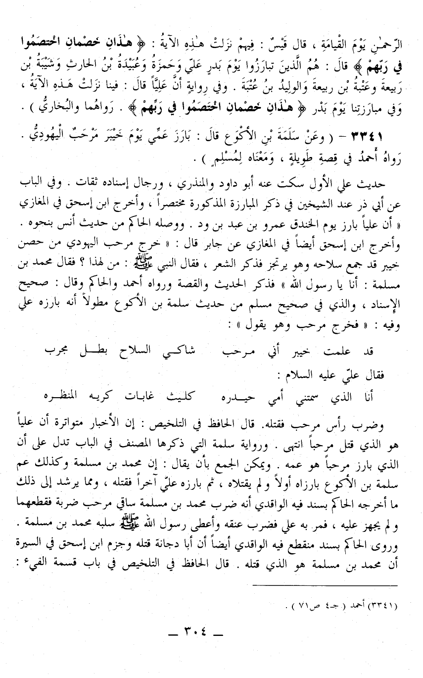 وَأَخْرَجَ ابْنُ إِسْحَاقَ فِي الْمَغَازِي " أَنَّ عَلِيًّا بَارَزَ يَوْمَ الْخَنْدَقِ عَمْرَو بْنَ عَبْدِ وُدٍّ. وَوَصَلَهُ الْحَاكِمُ مِنْ حَدِيثِ أَنَسٍ بِنَحْوِهِ. وَأَخْرَجَ ابْنُ إِسْحَاقَ أَيْضًا فِي الْمَغَازِي عَنْ جَابِرٍ قَالَ: «خَرَجَ مَرْحَبٌ الْيَهُودِيُّ مِنْ حِصْنِ خَيْبَرَ قَدْ جَمَعَ سِلَاحَهُ وَهُوَ يَرْتَجِزُ فَذَكَرَ الشِّعْرَ، فَقَالَ النَّبِيُّ - صَلَّى اللَّهُ عَلَيْهِ وَسَلَّمَ -: مَنْ لِهَذَا؟ فَقَالَ مُحَمَّدُ بْنُ مَسْلَمَةُ: أَنَا يَا رَسُولَ اللَّهِ» فَذَكَرَ الْحَدِيثَ وَالْقِصَّةَ وَرَوَاهُ أَحْمَدُ وَالْحَاكِمُ وَقَالَ: صَحِيحُ الْإِسْنَادِ، وَاَلَّذِي فِي صَحِيحِ مُسْلِمٍ مِنْ حَدِيثِ سَلَمَةَ بْنِ الْأَكْوَعِ مُطَوَّلًا أَنَّهُ بَارَزَهُ عَلِيٌّ وَفِيهِ: " فَخَرَجَ مَرْحَبٌ وَهُوَ يَقُولُ ":