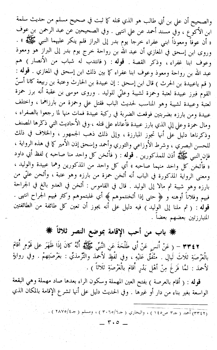 وَفِي رِوَايَةٍ لِأَحْمَدَ: لَمَّا فَرَغَ مِنْ أَهْلِ بَدْرٍ أَقَامَ بِالْعَرْصَةِ ثَلَاثًا) .