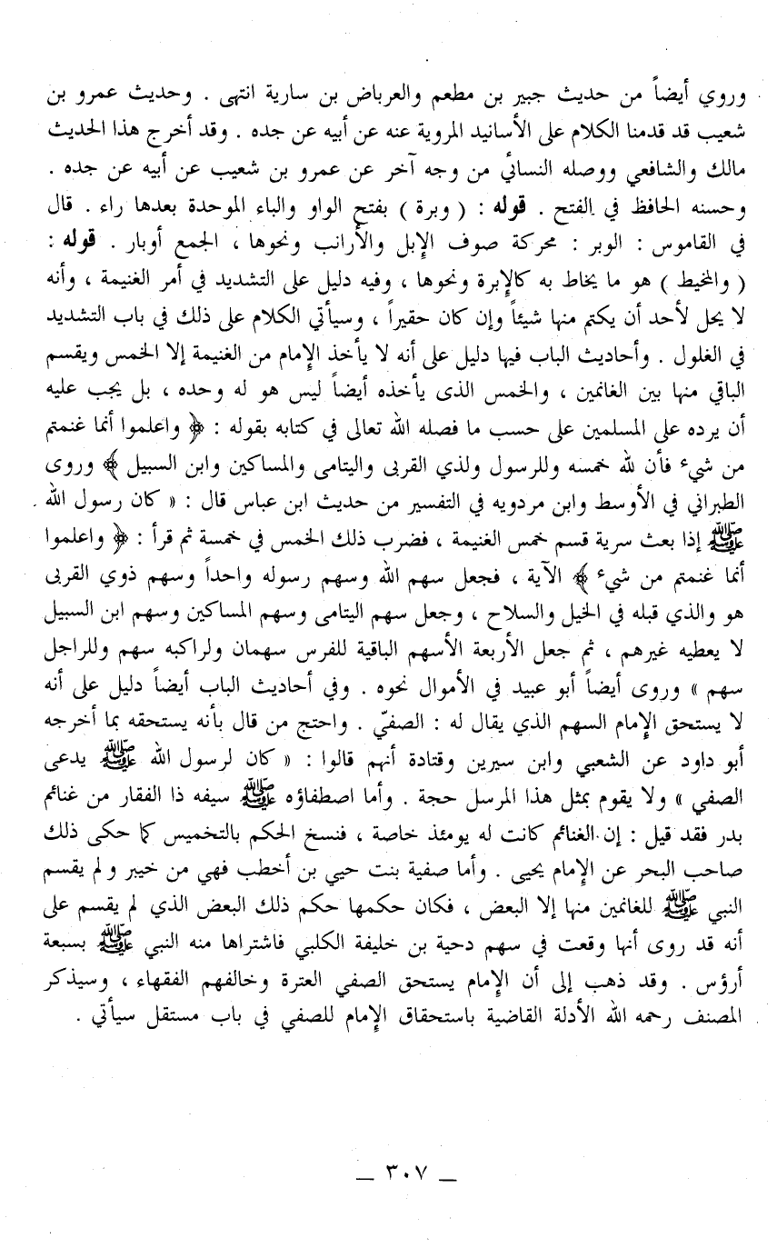 ـــــــــــــــــــــــــــــQوَرُوِيَ أَيْضًا مِنْ حَدِيثِ جُبَيْرِ بْنِ مُطْعِمٍ وَالْعِرْبَاضِ بْنِ سَارِيَةَ. انْتَهَى. وَحَدِيثُ عَمْرِو بْنِ شُعَيْبٍ قَدْ قَدَّمْنَا الْكَلَامَ عَلَى الْأَسَانِيدِ الْمَرْوِيَّةِ عَنْهُ عَنْ أَبِيهِ عَنْ جَدِّهِ. وَقَدْ أَخْرَجَ هَذَا الْحَدِيثَ مَالِكٌ وَالشَّافِعِيُّ وَوَصَلَهُ النَّسَائِيّ مِنْ وَجْهٍ آخَرَ عَنْ عَمْرِو بْنِ شُعَيْبٍ عَنْ أَبِيهِ عَنْ جَدِّهِ. وَحَسَّنَهُ الْحَافِظُ فِي الْفَتْحِ. قَوْلُهُ: (وَبَرَةً) بِفَتْحِ الْوَاوِ وَالْبَاءِ الْمُوَحَّدَةِ بَعْدَهَا رَاءٌ. قَالَ فِي الْقَامُوسِ: الْوَبَرُ: مُحَرَّكَةٌ صُوفُ الْإِبِلِ وَالْأَرَانِبِ وَنَحْوِهَا، الْجَمْعُ أَوْبَارٌ. قَوْلُهُ: (وَالْمِخْيَطُ) هُوَ مَا يُخَاطُ بِهِ كَالْإِبْرَةِ وَنَحْوِهَا، وَفِيهِ دَلِيلٌ عَلَى التَّشْدِيدِ فِي أَمْرِ الْغَنِيمَةِ، وَأَنَّهُ لَا يَحِلُّ لِأَحَدٍ أَنْ يَكْتُمَ مِنْهَا شَيْئًا وَإِنْ كَانَ حَقِيرًا، وَسَيَأْتِي الْكَلَامُ عَلَى ذَلِكَ فِي بَابِ التَّشْدِيدِ فِي الْغُلُولِ.