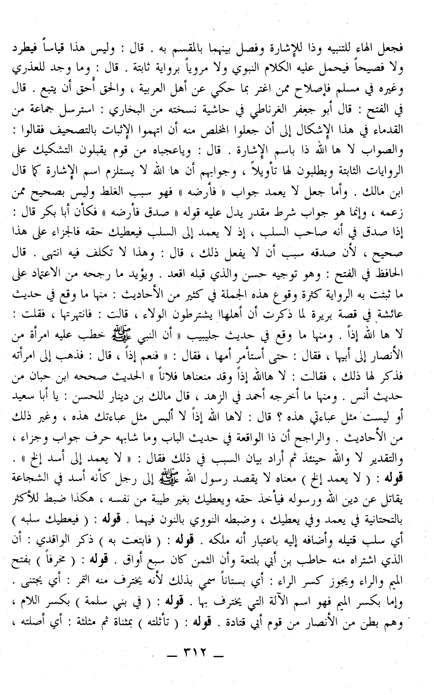 قَالَ: وَلَيْسَ هَذَا قِيَاسًا فَيَطَّرِدَ وَلَا فَصِيحًا فَيُحْمَلَ عَلَيْهِ الْكَلَامُ النَّبَوِيُّ وَلَا مَرْوِيًّا بِرِوَايَةٍ ثَابِتَةٍ. قَالَ: وَمَا وُجِدَ لِلْعُذْرِيِّ وَغَيْرِهِ فِي مُسْلِمٍ فَإِصْلَاحُ مِمَّنْ اغْتَرَّ بِمَا حُكِيَ عَنْ أَهْلِ الْعَرَبِيَّةِ، وَالْحَقُّ أَحَقُّ أَنْ يُتَّبَعَ. قَالَ فِي الْفَتْحِ: قَالَ أَبُو جَعْفَرٍ الْغَرْنَاطِيُّ فِي حَاشِيَةِ نُسْخَتِهِ مِنْ الْبُخَارِيِّ: اسْتَرْسَلَ جَمَاعَةٌ مِنْ الْقُدَمَاءِ فِي هَذَا الْإِشْكَالِ إلَى أَنْ جَعَلُوا الْمَخْلَصَ مِنْهُ أَنْ اتَّهَمُوا الْأَثْبَاتَ بِالتَّصْحِيفِ فَقَالُوا: وَالصَّوَابُ لَا هَا اللَّهِ ذَا بِاسْمِ الْإِشَارَةِ. قَالَ: وَيَا عَجَبَاهُ مِنْ قَوْمٍ يَقْبَلُونَ التَّشْكِيكَ عَلَى الرِّوَايَاتِ الثَّابِتَةِ وَيَطْلُبُونَ لَهَا تَأْوِيلًا، وَجَوَابُهُمْ أَنَّ هَا اللَّهِ لَا يَسْتَلْزِمُ اسْمَ الْإِشَارَةِ كَمَا قَالَ ابْنُ مَالِكٍ، وَأَمَّا جَعْلُ لَا يَعْمِدُ جَوَابَ " فَأَرْضِهِ " فَهُوَ سَبَبُ الْغَلَطِ وَلَيْسَ بِصَحِيحٍ مِمَّنْ زَعَمَهُ، وَإِنَّمَا هُوَ جَوَابُ شَرْطٍ مُقَدَّرٍ يَدُلُّ عَلَيْهِ قَوْلُهُ " صَدَقَ فَأَرْضِهِ " فَكَأَنَّ أَبَا بَكْرٍ قَالَ: إذًا صَدَقَ فِي أَنَّهُ صَاحِبُ السَّلَبِ، إذْ لَا يَعْمِدُ إلَى السَّلَبِ فَيُعْطِيَكَ حَقَّهُ فَالْجَزَاءُ عَلَى هَذَا صَحِيحٌ، لِأَنَّ صِدْقَهُ سَبَبُ أَنْ لَا يَفْعَلَ ذَلِكَ، قَالَ: وَهَذَا لَا تَكَلُّفَ فِيهِ انْتَهَى.