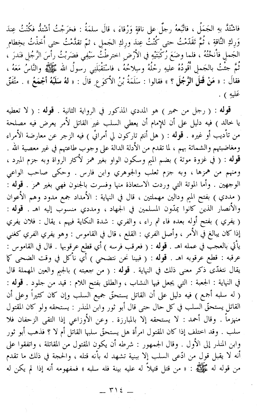 ـــــــــــــــــــــــــــــQفَاشْتَدَّ بِهِ الْجَمَلُ، فَاتَّبَعَهُ رَجُلٌ عَلَى نَاقَةٍ وَرْقَاءَ، قَالَ سَلَمَةُ: فَخَرَجْت أَشْتَدُّ فَكُنْتُ عِنْدَ وَرِكِ النَّاقَةِ، ثُمَّ تَقَدَّمَتْ حَتَّى كُنْتُ عِنْدَ وَرِكِ الْجَمَلِ، ثُمَّ تَقَدَّمَتْ حَتَّى أَخَذْتُ بِخِطَامِ الْجَمَلِ فَأَنَخْتُهُ، فَلَمَّا وَضَعَ رُكْبَتَيْهِ فِي الْأَرْضِ اخْتَرَطْت سَيْفِي فَضَرَبْت رَأْسَ الرَّجُلِ فَنَدَرَ، ثُمَّ جِئْت بِالْجَمَلِ أَقُودُهُ عَلَيْهِ رَحْلُهُ وَسِلَاحُهُ، فَاسْتَقْبَلَنِي رَسُولُ اللَّهِ - صَلَّى اللَّهُ عَلَيْهِ وَسَلَّمَ - وَالنَّاسُ مَعَهُ، فَقَالَ: مَنْ قَتَلَ الرَّجُلَ؟ فَقَالُوا: سَلَمَةُ بْنُ الْأَكْوَعِ قَالَ: لَهُ سَلَبُهُ أَجْمَعُ» . مُتَّفَقٌ عَلَيْهِ) .