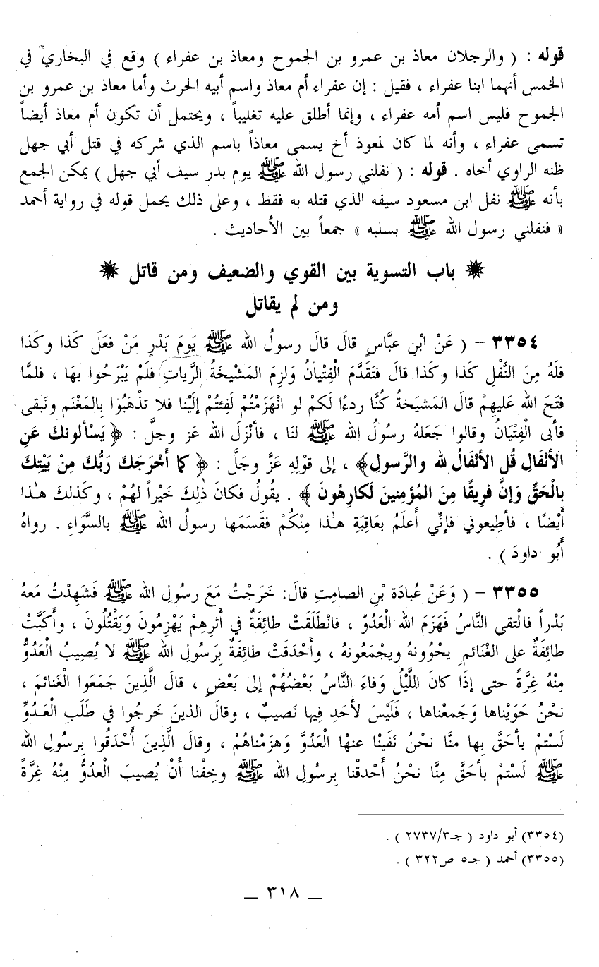 3354 - (عَنْ ابْنِ عَبَّاسٍ قَالَ «قَالَ رَسُولُ اللَّهِ - صَلَّى اللَّهُ عَلَيْهِ وَسَلَّمَ - يَوْمَ بَدْرٍ مَنْ فَعَلَ كَذَا وَكَذَا فَلَهُ مِنْ النَّفَلِ كَذَا وَكَذَا قَالَ فَتَقَدَّمَ الْفِتْيَانُ وَلَزِمَ الْمَشْيَخَةُ الرَّايَاتِ فَلَمْ يَبْرَحُوا بِهَا، فَلَمَّا فَتَحَ اللَّهُ عَلَيْهِمْ قَالَ الْمَشْيَخَةُ: كُنَّا رِدْءًا لَكُمْ لَوْ انْهَزَمْتُمْ لَفِئْتُمْ إلَيْنَا فَلَا تَذْهَبُوا بِالْمَغْنَمِ وَنَبْقَى فَأَبَى الْفِتْيَانُ وَقَالُوا: جَعَلَهُ رَسُولُ اللَّهِ - صَلَّى اللَّهُ عَلَيْهِ وَسَلَّمَ - لَنَا، فَأَنْزَلَ اللَّهُ عَزَّ وَجَلَّ: {يَسْأَلُونَكَ عَنِ الأَنْفَالِ قُلِ الأَنْفَالُ لِلَّهِ وَالرَّسُولِ} [الأنفال: 1] ، إلَى قَوْلِهِ عَزَّ وَجَلَّ: {كَمَا أَخْرَجَكَ رَبُّكَ مِنْ بَيْتِكَ بِالْحَقِّ وَإِنَّ فَرِيقًا مِنَ الْمُؤْمِنِينَ لَكَارِهُونَ} [الأنفال: 5] . يَقُولُ فَكَانَ ذَلِكَ خَيْرًا لَهُمْ، وَكَذَلِكَ هَذَا أَيْضًا، فَأَطِيعُونِي فَإِنِّي أَعْلَمُ بِعَاقِبَةِ هَذَا مِنْكُمْ فَقَسَمَهَا رَسُولُ اللَّهِ - صَلَّى اللَّهُ عَلَيْهِ وَسَلَّمَ - بِالسَّوَاءِ» . رَوَاهُ أَبُو دَاوُد) .