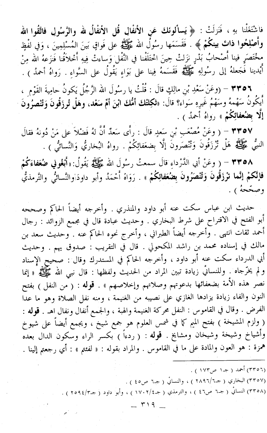 فَاشْتَغَلْنَا بِهِ، فَنَزَلَتْ: {يَسْأَلُونَكَ عَنِ الأَنْفَالِ قُلِ الأَنْفَالُ لِلَّهِ وَالرَّسُولِ فَاتَّقُوا اللَّهَ وَأَصْلِحُوا ذَاتَ بَيْنِكُمْ} [الأنفال: 1] . فَقَسَمَهَا رَسُولُ اللَّهِ - صَلَّى اللَّهُ عَلَيْهِ وَسَلَّمَ - عَلَى فُوَاقٍ بَيْنَ الْمُسْلِمِينَ، وَفِي لَفْظٍ مُخْتَصَرٍ فِينَا - أَصْحَابَ بَدْرٍ - نَزَلَتْ حِينَ اخْتَلَفْنَا فِي النَّفَلِ وَسَاءَتْ فِيهِ أَخْلَاقُنَا فَنَزَعَهُ اللَّهُ مِنْ أَيْدِينَا فَجَعَلَهُ فِي رَسُولِهِ - صَلَّى اللَّهُ عَلَيْهِ وَسَلَّمَ - فَقَسَمَهُ فِينَا عَلَى بَوَاءٍ يَقُولُ عَلَى السَّوَاءِ» . رَوَاهُ أَحْمَدُ) .