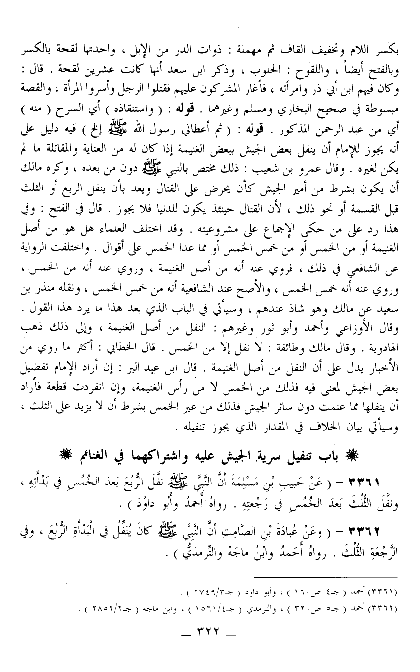 قَوْلُهُ: (وَاسْتِنْقَاذَهُ) أَيْ السَّرْحِ (مِنْهُ) أَيْ مِنْ عَبْدِ الرَّحْمَنِ الْمَذْكُورِ. قَوْلُهُ: (ثُمَّ أَعْطَانِي رَسُولُ اللَّهِ - صَلَّى اللَّهُ عَلَيْهِ وَسَلَّمَ -. . . إلَخْ) فِيهِ دَلِيلٌ عَلَى أَنَّهُ يَجُوزُ لِلْإِمَامِ أَنْ يُنَفِّلَ بَعْضَ الْجَيْشِ بِبَعْضِ الْغَنِيمَةِ إذَا كَانَ لَهُ مِنْ الْعِنَايَةِ وَالْمُقَاتَلَةِ مَا لَمْ يَكُنْ لِغَيْرِهِ. وَقَالَ عَمْرُو بْنُ شُعَيْبٍ: ذَلِكَ مُخْتَصٌّ بِالنَّبِيِّ - صَلَّى اللَّهُ عَلَيْهِ وَسَلَّمَ - دُونَ مَنْ بَعْدَهُ، وَكَرِهَ مَالِكٌ أَنْ يَكُونَ بِشَرْطٍ مِنْ أَمِيرِ الْجَيْشِ كَأَنْ يُحَرِّضَ عَلَى الْقِتَالِ وَيَعِدَ بِأَنْ يُنَفِّلَ الرُّبُعَ أَوْ الثُّلُثَ قَبْلَ الْقِسْمَةِ أَوْ نَحْوِ ذَلِكَ، لِأَنَّ الْقِتَالَ حِينَئِذٍ يَكُونُ لِلدُّنْيَا فَلَا يَجُوزُ. قَالَ فِي الْفَتْحِ: وَفِي هَذَا رَدٌّ عَلَى مَنْ حَكَى الْإِجْمَاعَ عَلَى مَشْرُوعِيَّتِهِ. وَقَدْ اخْتَلَفَ الْعُلَمَاءُ هَلْ هُوَ مِنْ أَصْلِ الْغَنِيمَةِ أَوْ مِنْ الْخُمُسِ أَوْ مِنْ خُمُسِ الْخُمُسِ أَوْ مِمَّا عَدَا الْخُمُسَ عَلَى أَقْوَالٍ