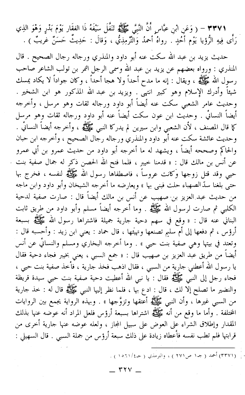 3371 - (وَعَنْ ابْنِ عَبَّاسٍ «أَنَّ النَّبِيَّ - صَلَّى اللَّهُ عَلَيْهِ وَسَلَّمَ - تَنَفَّلَ سَيْفَهُ ذَا الْفَقَارِ يَوْمَ بَدْرٍ وَهُوَ الَّذِي رَأَى فِيهِ الرُّؤْيَا يَوْمَ أُحُدٍ» . رَوَاهُ أَحْمَدُ وَالتِّرْمِذِيُّ، وَقَالَ: حَدِيثٌ حَسَنٌ غَرِيبٌ) .