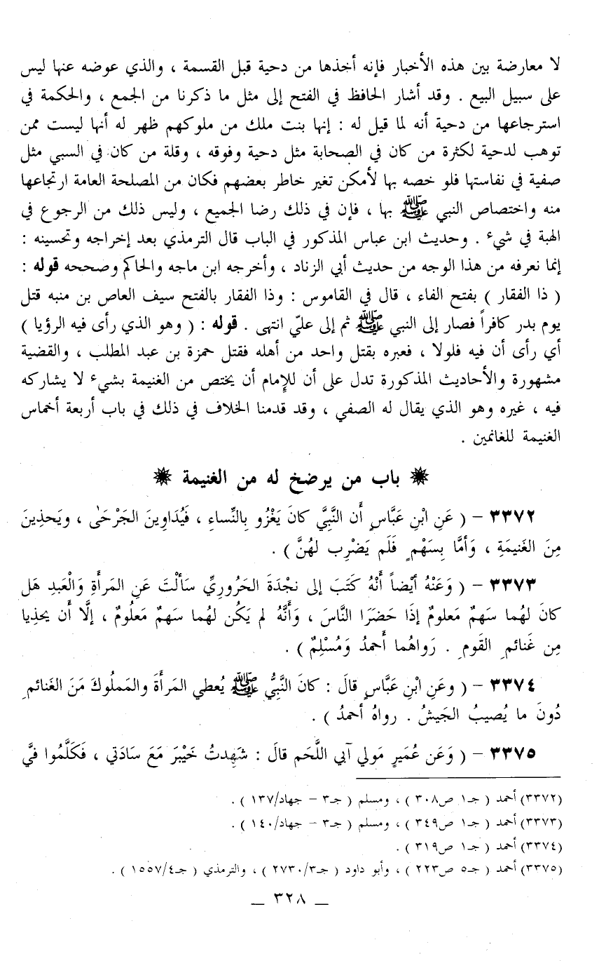 3373 - «وَعَنْهُ أَيْضًا أَنَّهُ كَتَبَ إلَى نَجْدَةَ الْحَرُورِيِّ سَأَلْت عَنْ الْمَرْأَةِ وَالْعَبْدِ هَلْ كَانَ لَهُمَا سَهْمٌ مَعْلُومٌ إذَا حَضَرَا النَّاسَ، وَأَنَّهُ لَمْ يَكُنْ لَهُمَا سَهْمٌ مَعْلُومٌ، إلَّا أَنْ يُحْذَيَا مِنْ غَنَائِمِ الْقَوْمِ» . رَوَاهُمَا أَحْمَدُ وَمُسْلِمٌ) .