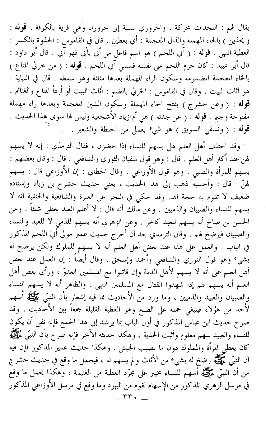قَالَ: وَأَحْسَبُهُ ذَهَبَ إلَى هَذَا الْحَدِيثِ، يَعْنِي حَدِيثَ حَشْرَجِ بْنِ زِيَادٍ وَإِسْنَادُهُ ضَعِيفٌ لَا تَقُومُ بِهِ حُجَّةٌ وَقَدْ حُكِيَ فِي الْبَحْرِ عَنْ الْعِتْرَةِ وَالشَّافِعِيَّةِ وَالْحَنَفِيَّةِ أَنَّهُ لَا يُسْهَمُ لِلنِّسَاءِ وَالصِّبْيَانِ وَالذِّمِّيِّينَ. وَعَنْ مَالِكٍ أَنَّهُ قَالَ: لَا أَعْلَمُ الْعَبْدَ يُعْطَى شَيْئًا. وَعَنْ الْحَسَنِ بْنِ صَالِحٍ أَنَّهُ يُسْهَمُ لِلْعَبْدِ كَالْحُرِّ. وَعَنْ الزُّهْرِيِّ أَنَّهُ يُسْهَمُ لِلذِّمِّيِّ لَا لِلْعَبْدِ وَالنِّسَاءِ وَالصِّبْيَانِ فَيُرْضَخُ لَهُمْ. وَقَالَ التِّرْمِذِيُّ بَعْدَ أَنْ أَخْرَجَ حَدِيثَ عُمَيْرٍ مَوْلَى آبِي اللَّحْمِ الْمَذْكُورَ فِي الْبَابِ. وَالْعَمَلُ عَلَى هَذَا عِنْدَ بَعْضِ أَهْلِ الْعِلْمِ أَنَّهُ لَا يُسْهَمُ لِلْمَمْلُوكِ وَلَكِنْ يُرْضَخُ لَهُ بِشَيْءٍ وَهُوَ قَوْلُ الثَّوْرِيِّ وَالشَّافِعِيِّ وَأَحْمَدُ وَإِسْحَاقُ. وَقَالَ أَيْضًا: إنَّ الْعَمَلَ عِنْدَ بَعْضِ أَهْلِ الْعِلْمِ عَلَى أَنَّهُ لَا يُسْهَمُ لِأَهْلِ الذِّمَّةِ وَإِنْ قَاتَلُوا مَعَ الْمُسْلِمِينَ الْعَدُوَّ، وَرَأَى بَعْضُ أَهْلِ الْعِلْمِ أَنَّهُ يُسْهَمُ لَهُمْ إذَا شَهِدُوا الْقِتَالَ مَعَ الْمُسْلِمِينَ انْتَهَى.