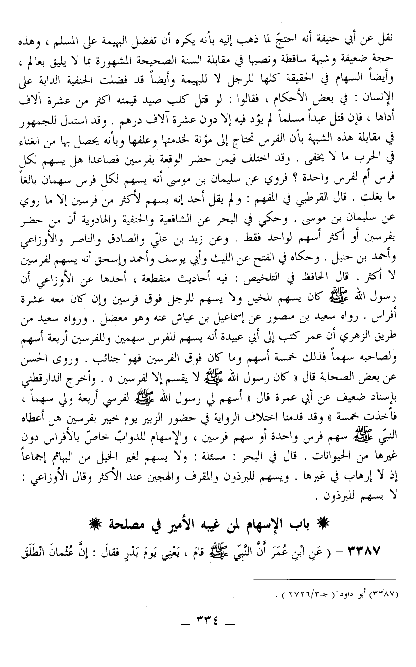 ـــــــــــــــــــــــــــــQنُقِلَ عَنْ أَبِي حَنِيفَةَ أَنَّهُ احْتَجَّ لِمَا ذَهَبَ إلَيْهِ بِأَنَّهُ يُكْرَهُ أَنْ تُفَضَّلَ الْبَهِيمَةُ عَلَى الْمُسْلِمِ، وَهَذِهِ حُجَّةٌ ضَعِيفَةٌ وَشُبْهَةٌ سَاقِطَةٌ وَنَصْبُهَا فِي مُقَابَلَةِ السُّنَّةِ الصَّحِيحَةِ الْمَشْهُورَةِ مِمَّا لَا يَلِيقُ بِعَالِمٍ، وَأَيْضًا السِّهَامُ فِي الْحَقِيقَةِ كُلُّهَا لِلرَّجُلِ لَا لِلْبَهِيمَةِ وَأَيْضًا قَدْ فَضَّلَتْ الْحَنَفِيَّةُ الدَّابَّةَ عَلَى الْإِنْسَانِ فِي بَعْضِ الْأَحْكَامِ، فَقَالُوا: لَوْ قَتَلَ كَلْبَ صَيْدٍ قِيمَتُهُ أَكْثَرُ مِنْ عَشْرَةِ آلَافٍ أَدَّاهَا، فَإِنْ قَتَلَ عَبْدًا مُسْلِمًا لَمْ يُؤَدِّ فِيهِ إلَّا دُونَ عَشْرَةِ آلَافِ دِرْهَمٍ.