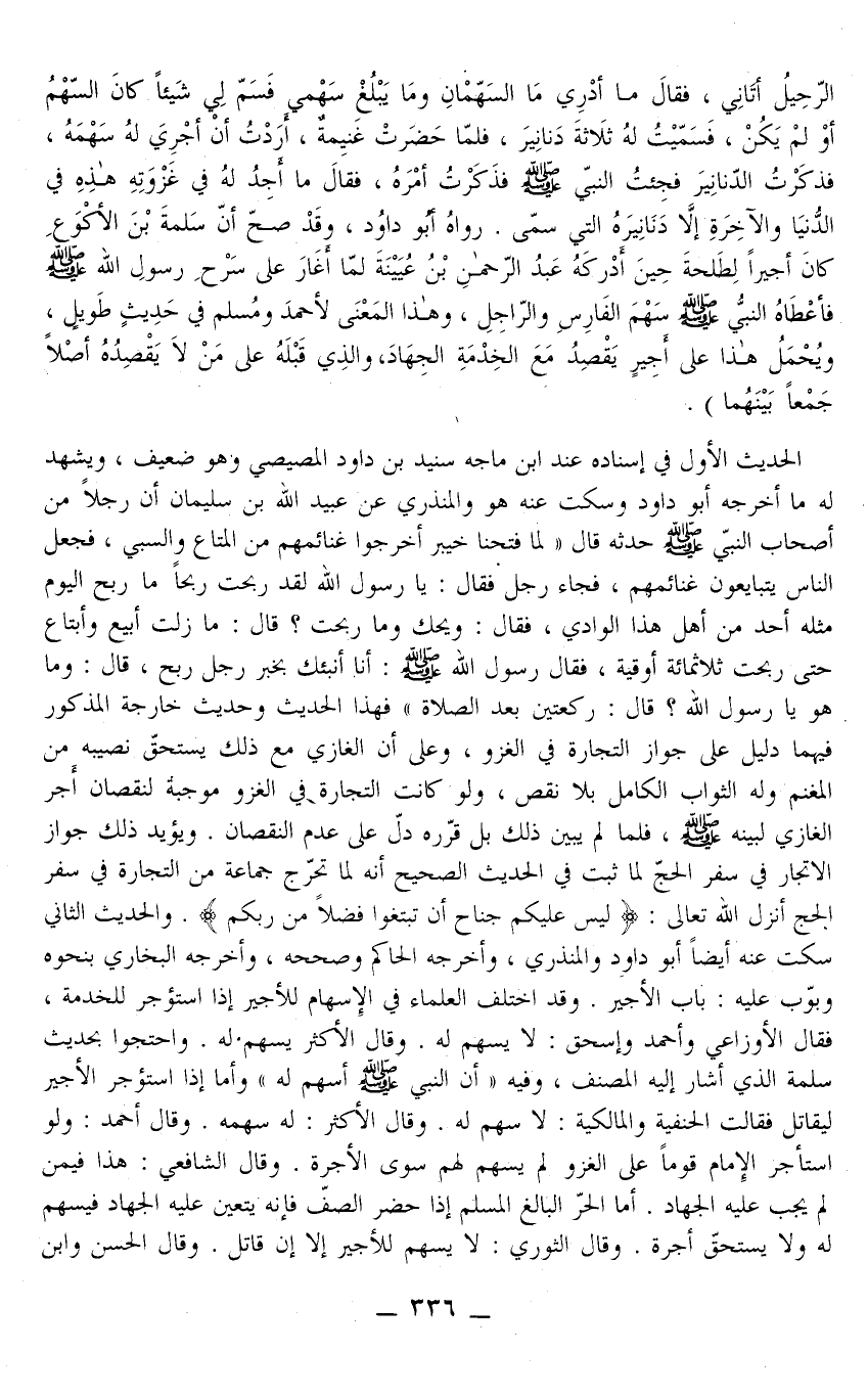 الْحَدِيثُ الْأَوَّلِ فِي إسْنَادِهِ عِنْدَ ابْنِ مَاجَهْ سَنِيدُ بْنِ دَاوُد الْمِصِّيصِيِّ وَهُوَ ضَعِيفٌ، وَيَشْهَدُ لَهُ مَا أَخْرَجَهُ أَبُو دَاوُد وَسَكَتَ عَنْهُ هُوَ وَالْمُنْذِرِيُّ عَنْ عُبَيْدِ اللَّهِ بْنِ سُلَيْمَانَ أَنَّ رَجُلًا مِنْ أَصْحَابِ النَّبِيِّ - صَلَّى اللَّهُ عَلَيْهِ وَسَلَّمَ - حَدَّثَهُ قَالَ «لَمَّا فَتَحْنَا خَيْبَرَ أَخْرَجُوا غَنَائِمَهُمْ مِنْ الْمَتَاعِ وَالسَّبْيِ، فَجَعَلَ النَّاسُ يَتَبَايَعُونَ غَنَائِمَهُمْ، فَجَاءَ رَجُلٌ فَقَالَ: يَا رَسُولَ اللَّهِ لَقَدْ رَبِحْتُ رِبْحًا مَا رَبِحَ الْيَوْمَ مِثْلَهُ أَحَدٌ مِنْ أَهْلِ هَذَا الْوَادِي، فَقَالَ: وَيْحَكَ وَمَا رَبِحْتَ؟ قَالَ: مَازِلْتُ أَبِيعُ وَأَبْتَاعُ حَتَّى رَبِحْتُ ثَلَاثَمِائَةِ أُوقِيَّةٍ، فَقَالَ رَسُولُ اللَّهِ - صَلَّى اللَّهُ عَلَيْهِ وَسَلَّمَ -: أَنَا أُنْبِئُكَ بِخَبَرِ رَجُلٍ رَبِحَ، قَالَ: وَمَا هُوَ يَا رَسُولَ اللَّهِ؟ قَالَ: رَكْعَتَيْنِ بَعْدَ الصَّلَاةِ» فَهَذَا الْحَدِيثُ وَحَدِيثُ خَارِجَةَ الْمَذْكُورُ فِيهِمَا دَلِيلٌ عَلَى جَوَازِ التِّجَارَةِ فِي الْغَزْوِ، وَعَلَى أَنَّ الْغَازِيَ مَعَ ذَلِكَ يَسْتَحِقُّ نَصِيبَهُ مِنْ الْمَغْنَمِ وَلَهُ الثَّوَابُ الْكَامِلُ بِلَا نَقْصٍ، وَلَوْ كَانَتْ التِّجَارَةُ فِي الْغَزْوِ مُوجِبَةً لِنُقْصَانِ أَجْرِ الْغَازِي لَبَيَّنَهُ - صَلَّى اللَّهُ عَلَيْهِ وَسَلَّمَ -، فَلَمَّا لَمْ يُبَيِّنْ ذَلِكَ بَلْ قَرَّرَهُ دَلَّ عَلَى عَدَمِ النُّقْصَانِ.